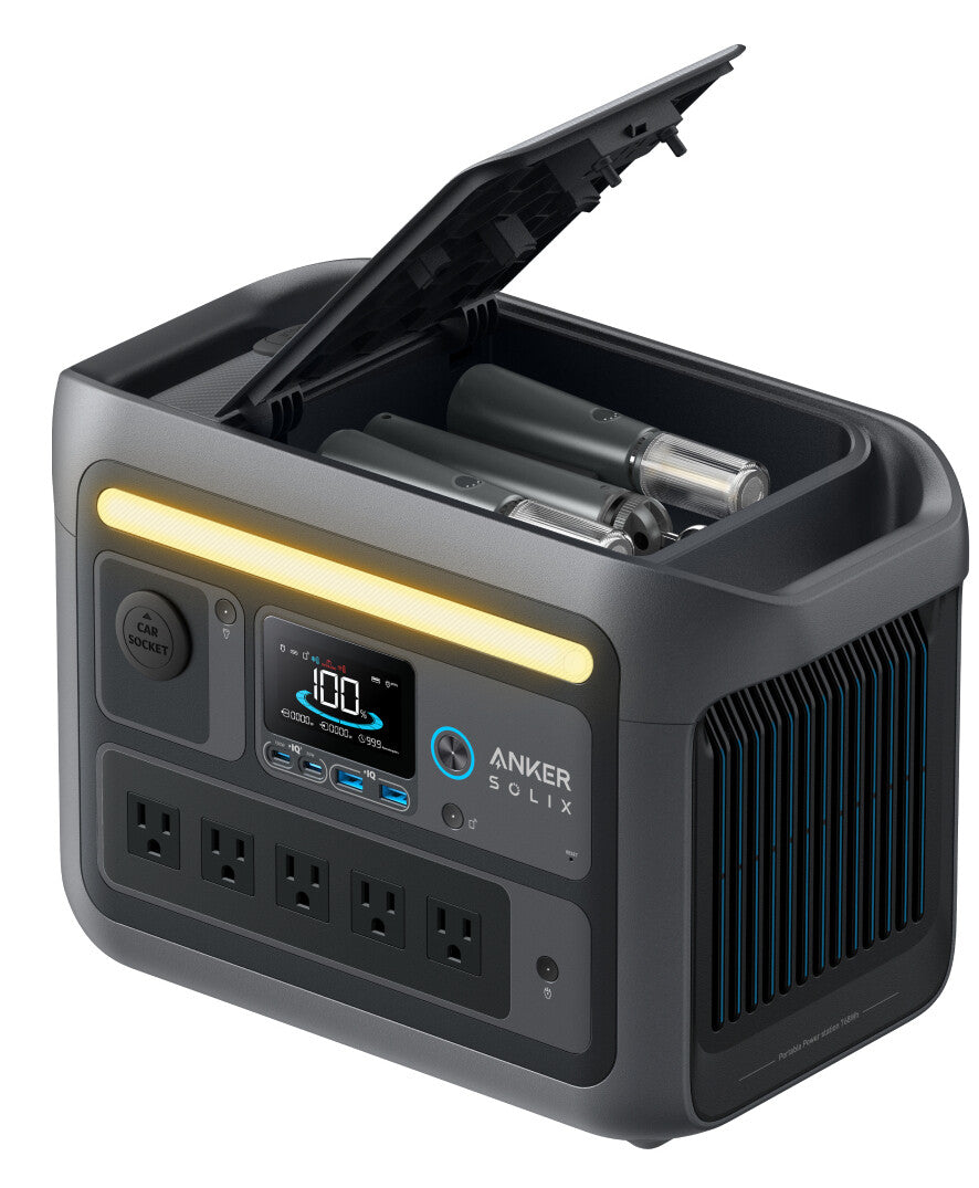 First Portable Power Station with 3-Mode Camping Lights. 768Wh and High-Performing 1200W Rated Power and recharging in just 58 minutes. Achieve 80% battery capacity in just 2.3 hours with 300W max solar input. Monitor energy intelligently via the app and recharging in just 58 minutes. Plug in up to 10 appliances all at once and no energy limits under 1600W with SurgePad technology. 10-year long-Lasting LFP batteries with 3,000 Cycles and 5-year hassle-free warranty. 3-Mode Camping Lights. With two detachable lights featuring three modes, you're ready to light up any camping situation.. 768Wh | 1200W. Power up outdoor activities with Anker SOLIX C800 Plus Portable Power Station. With 768Wh capacity and 1200W output, charge speakers, a guitar, and a cooler for non-stop entertainment.. 1600W Surgepad. Never face power limitations with 1600W SurgePad technology. Power-demanding appliances —all are all of them at once.. Long-Lasting Portable Power Station. This power station lasts 6 times longer with LiFePO4 batteries, a unibody drop-proof build, industrial-grade components, advanced circuitry, and superior cooling.. 100% HyperFlash™ AC Recharging in 58 Mins. Plug into an 1100W AC outlet and activate UltraFast mode for a full recharge in 58 minutes. That's 17% faster than other power stations with similar capacity.. Performance. PowerIQ. Yes. Solar panel power. 300 W. Total output power. 1200 W. Fast charging technology. Ultra Charge. Fast charging. Yes. Charging source. AC, Cigar lighter, Solar. Number of charging cycles. 3000. Number of simultaneously connected devices (max). 8. Design. LED indicators. Yes. Built-in light. Yes. Control type. Buttons. Built-in display. Yes. Product colour. Black. Ports & interfaces. USB Type-C ports quantity. 2. USB Type-A output ports. 2. USB port. Yes. USB connector type. USB Type-A, USB Type-C. AC outlets quantity. 3 AC outlet(s). Packaging content. Quantity per pack. 1 pc(s). Packaging data. Package weight. 10 kg. Package height. 205 mm. Package depth. 371 mm. Package width. 251 mm