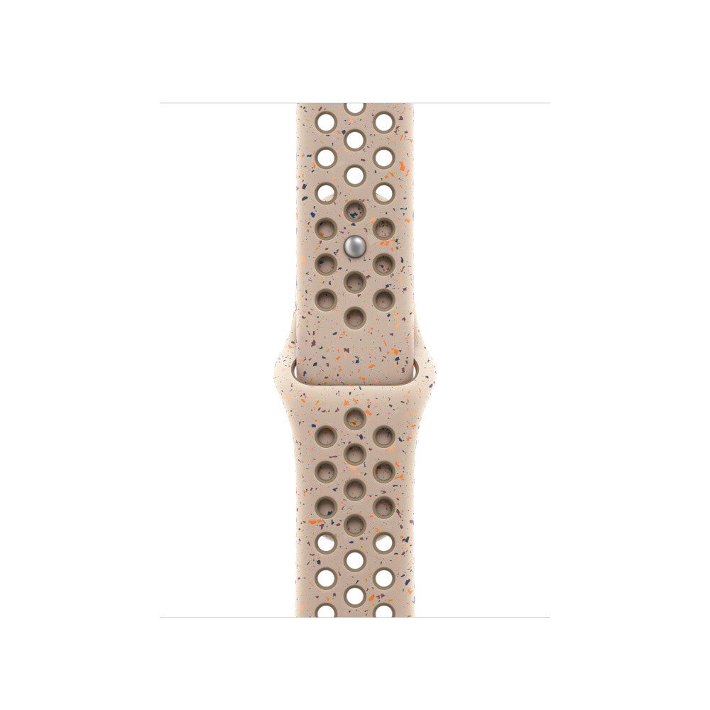 Band. Compatible device type: Smartwatch Apple. Material: Aluminium, Fluoroelastomer. Beige. 1 pc(s). Made with compression-moulded perforations for breathability, the Nike Sport Band is durable and strong, yet surprisingly soft. It features colourful flakes that create a randomised pattern, making each strap completely unique. The smooth, dense material drapes elegantly across your wrist and feels comfortable next to your skin. A new aluminium pin-and-tuck closure gives the pin a fresh matt finish.. This strap contains at least 32% recycled fluoroelastomer, with each flake containing at least 66% recycled fluoroelastomer.. Features. Band size. S/M. Buckle material. Aluminium. Material. Aluminium, Fluoroelastomer. Compatibility. Apple Watch 38 mm, 40 mm, 41 mm. Brand compatibility. Apple. Product colour. Beige. Compatible device type. Smartwatch. Product type. Band. Weight & dimensions. Wrist size range. 130 - 180 mm. Packaging content. Quantity per pack. 1 pc(s)