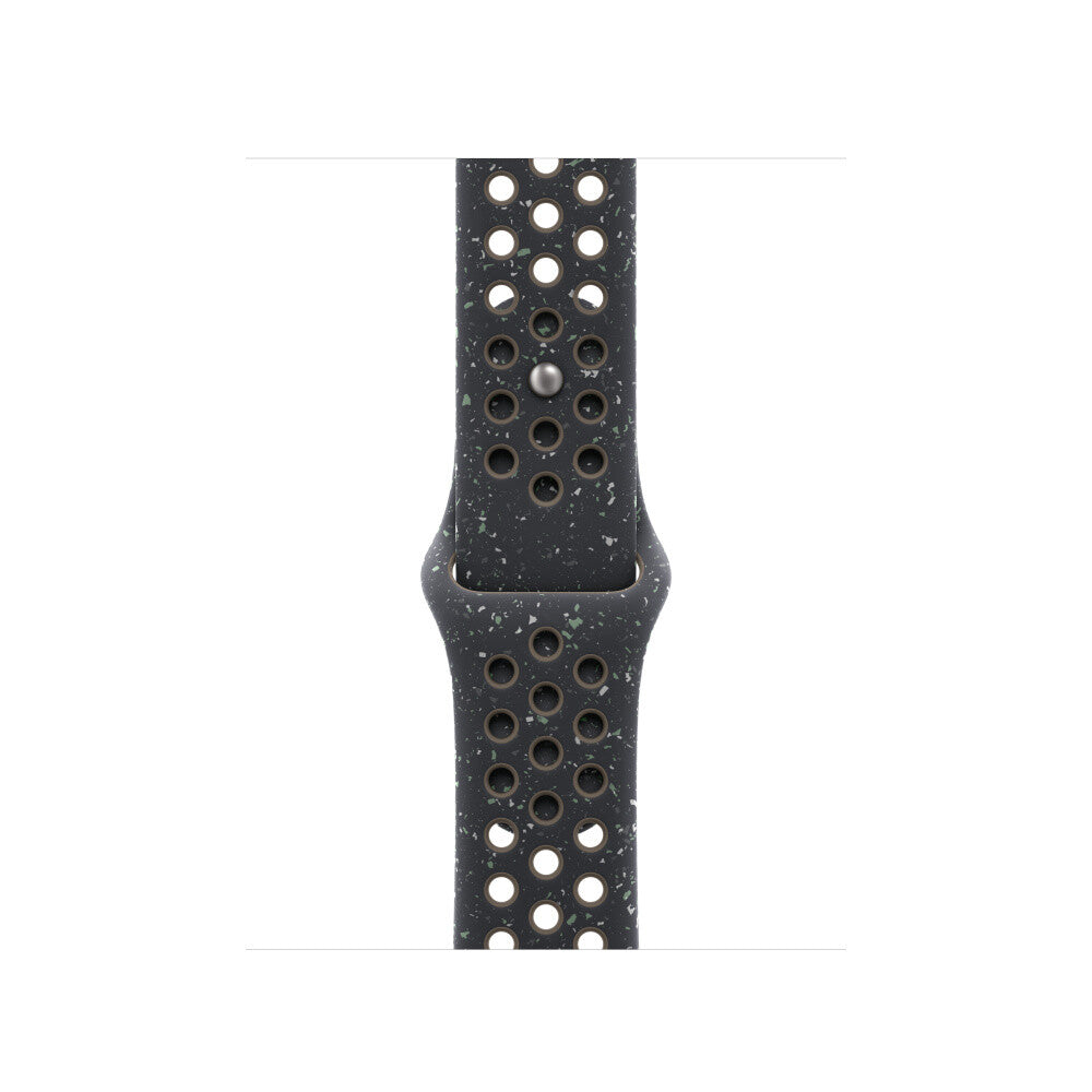 Band. Compatible device type: Smartwatch Apple. Material: Aluminium, Fluoroelastomer. Black. 1 pc(s). Made with compression-moulded perforations for breathability, the Nike Sport Band is durable and strong, yet surprisingly soft. It features colourful flakes that create a randomised pattern, making each strap completely unique. The smooth, dense material drapes elegantly across your wrist and feels comfortable next to your skin. A new aluminium pin-and-tuck closure gives the pin a fresh matt finish.. This strap contains at least 32% recycled fluoroelastomer, with each flake containing at least 66% recycled fluoroelastomer.. Features. Band size. S/M. Buckle material. Aluminium. Material. Aluminium, Fluoroelastomer. Compatibility. Apple Watch 38 mm, 40 mm, 41 mm. Brand compatibility. Apple. Product colour. Black. Compatible device type. Smartwatch. Product type. Band. Weight & dimensions. Wrist size range. 130 - 180 mm. Packaging content. Quantity per pack. 1 pc(s)