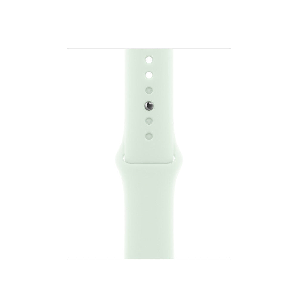 Band. Compatible device type: Smartwatch Apple. Material: Fluoroelastomer. Mint colour. 1 pc(s). Made from a custom high-performance fluoroelastomer, the Sport Band is durable and strong, yet surprisingly soft. The smooth, dense material drapes elegantly across your wrist and feels comfortable next to your skin. An innovative pin-and-tuck closure ensures a clean fit.. Features. Band size. S/M. Colour name. Soft Mint. Material. Fluoroelastomer. Compatibility. Apple Watch 38mm, 40mm, 41mm. Brand compatibility. Apple. Product colour. Mint colour. Compatible device type. Smartwatch. Product type. Band. Weight & dimensions. Wrist size range. 130 - 180 mm. Weight. 74 g. Height. 12.5 mm. Depth. 237 mm. Width. 76 mm. Packaging content. Quantity per pack. 1 pc(s)