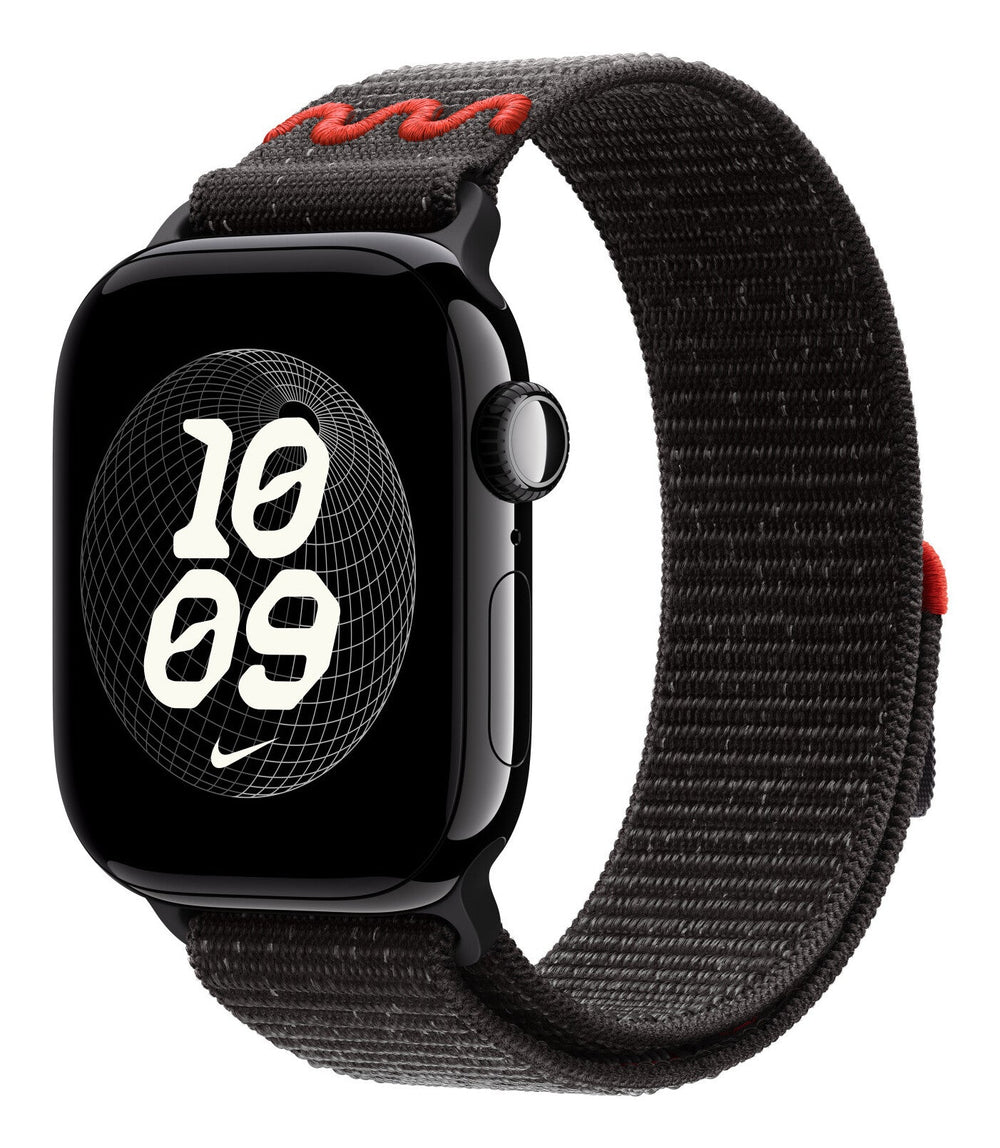 Band. Compatible device type: Smartwatch Apple. Material: Nylon, Recycled polyester, Spandex. Lightweight. Black. 1 pc(s). Redesigned with reflective yarn, the Nike Sport Loop is a soft, breathable and lightweight strap that has a subtle shine. A hook-and-loop fastener and a woven pull tab featuring the Run Swoosh logo make it easy to adjust on the go. The double-layer nylon weave has dense loops on the skin side that provide soft cushioning while allowing moisture to escape.. Features. Clasp type. Hook-and-loop clasp. Band size. One Size. Lightweight. Yes. Colour name. Midnight Black. Material. Nylon, Recycled polyester, Spandex. Compatibility. Apple Watch: 38mm, 40mm, 41mm, 42mm. Brand compatibility. Apple. Product colour. Black. Compatible device type. Smartwatch. Product type. Band. Weight & dimensions. Package weight. 49 g. Package height. 12.5 mm. Package depth. 237 mm. Package width. 76 mm. Wrist size range. 130 - 190 mm. Width. 42 mm. Packaging content. Quantity per pack. 1 pc(s)