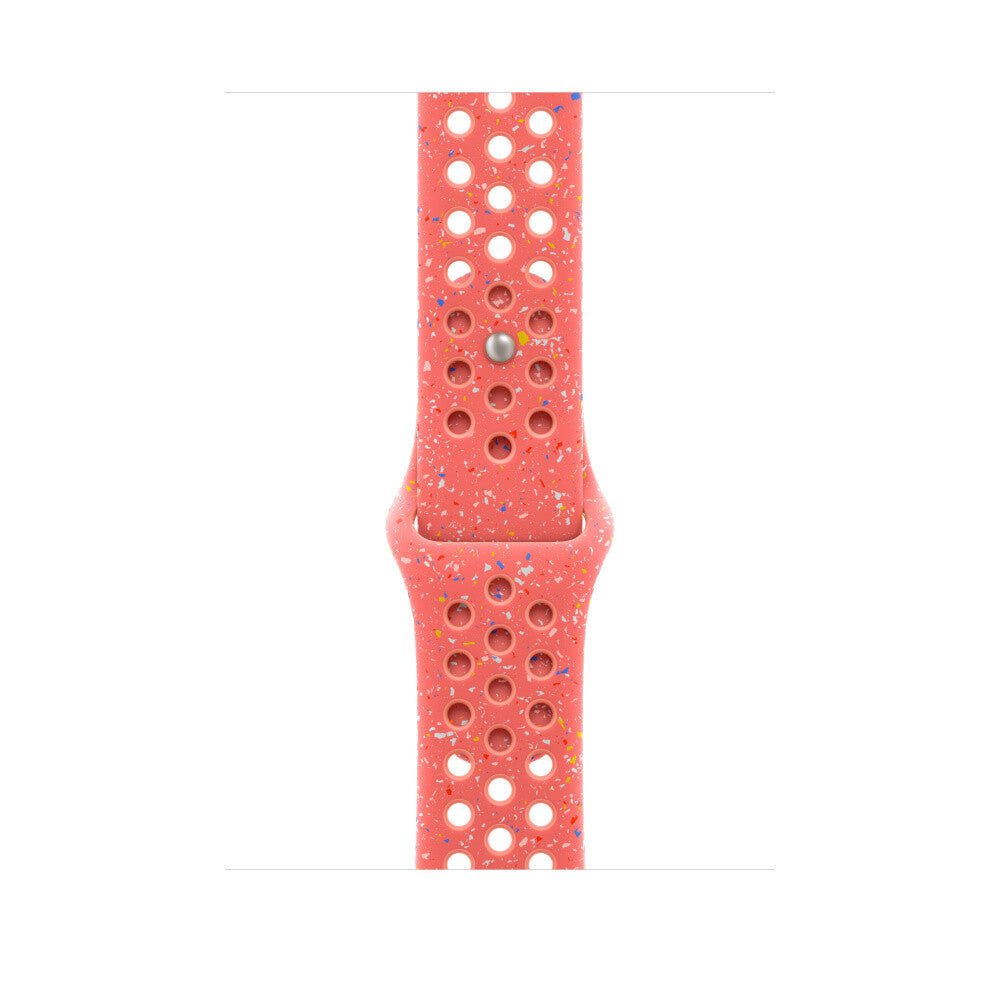 Band. Compatible device type: Smartwatch Apple. Material: Aluminium, Fluoroelastomer. Coral. 1 pc(s). Made with compression-moulded perforations for breathability, the Nike Sport Band is durable and strong, yet surprisingly soft. It features colourful flakes that create a randomised pattern, making each strap completely unique. The smooth, dense material drapes elegantly across your wrist and feels comfortable next to your skin. A new aluminium pin-and-tuck closure gives the pin a fresh matt finish.. This strap contains at least 32% recycled fluoroelastomer, with each flake containing at least 66% recycled fluoroelastomer.. Features. Band size. S/M. Buckle material. Aluminium. Material. Aluminium, Fluoroelastomer. Compatibility. Apple Watch 42mm, 44mm, 45mm, 49mm. Brand compatibility. Apple. Product colour. Coral. Compatible device type. Smartwatch. Product type. Band. Weight & dimensions. Wrist size range. 140 - 190 mm. Packaging content. Quantity per pack. 1 pc(s)