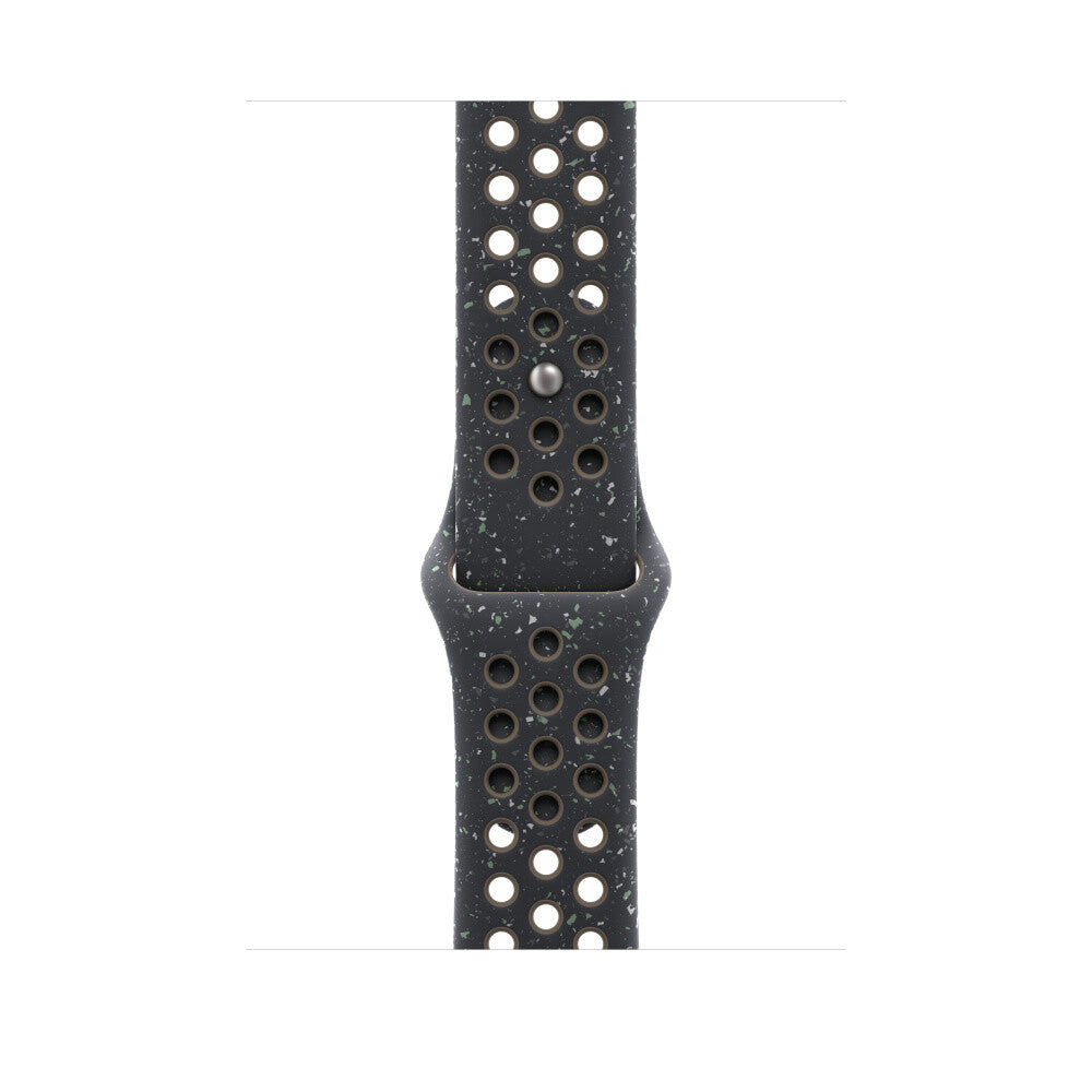 Band. Compatible device type: Smartwatch Apple. Material: Aluminium, Fluoroelastomer. Black. 1 pc(s). Made with compression-moulded perforations for breathability, the Nike Sport Band is durable and strong, yet surprisingly soft. It features colourful flakes that create a randomised pattern, making each strap completely unique. The smooth, dense material drapes elegantly across your wrist and feels comfortable next to your skin. A new aluminium pin-and-tuck closure gives the pin a fresh matt finish.. This strap contains at least 32% recycled fluoroelastomer, with each flake containing at least 66% recycled fluoroelastomer.. Features. Band size. M/L. Buckle material. Aluminium. Material. Aluminium, Fluoroelastomer. Compatibility. Apple Watch 42mm, 44mm, 45mm, 49mm. Brand compatibility. Apple. Product colour. Black. Compatible device type. Smartwatch. Product type. Band. Weight & dimensions. Wrist size range. 160 - 210 mm. Packaging content. Quantity per pack. 1 pc(s)