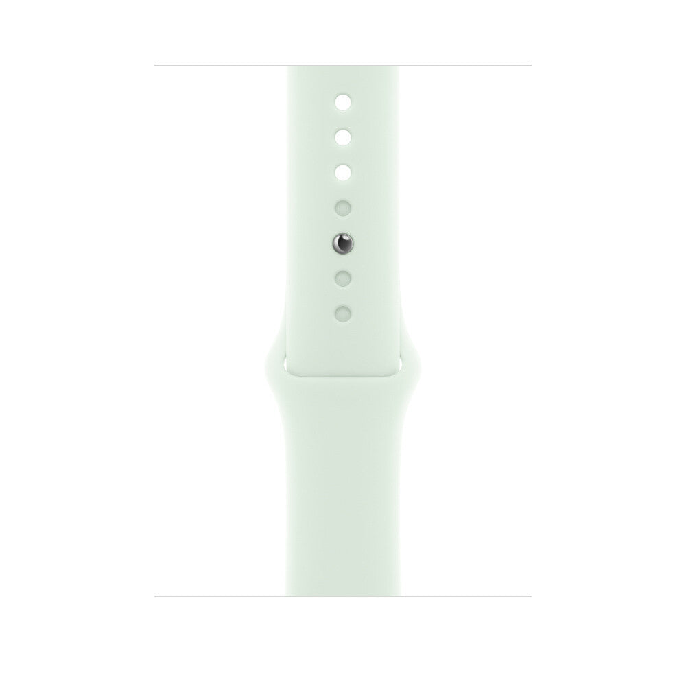 Band. Compatible device type: Smartwatch Apple. Material: Fluoroelastomer. Mint colour. 1 pc(s). Made from a custom high-performance fluoroelastomer, the Sport Band is durable and strong, yet surprisingly soft. The smooth, dense material drapes elegantly across your wrist and feels comfortable next to your skin. An innovative pin-and-tuck closure ensures a clean fit.. Features. Band size. S/M. Colour name. Soft Mint. Material. Fluoroelastomer. Compatibility. Apple Watch 42mm, 44mm, 45mm, 49mm. Brand compatibility. Apple. Product colour. Mint colour. Compatible device type. Smartwatch. Product type. Band. Weight & dimensions. Wrist size range. 140 - 190 mm. Weight. 74 g. Height. 12.5 mm. Depth. 237 mm. Width. 76 mm. Packaging content. Quantity per pack. 1 pc(s)
