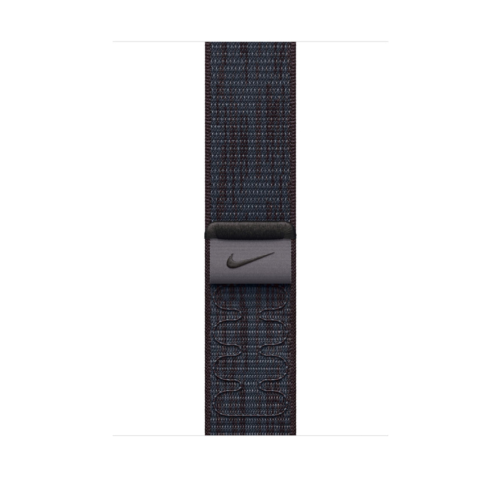 Band. Compatible device type: Smartwatch Apple. Material: Nylon. Black, Blue. 1 pc(s). The Nike Sport Loop has been redesigned to use excess yarn from previous seasons to create a soft, breathable and lightweight strap with a bold pattern. The hook-and-loop fastener and a woven pull tab featuring the Nike Swoosh makes it easy to adjust on the go. The double-layer nylon weave has dense loops on the skin side that provide soft cushioning while allowing moisture to escape.. The Nike Sport Loop contains at least 68% excess yarn from previous seasons, saving over three tonnes of primary yarn.. Features. Clasp type. Hook-and-loop clasp. Band size. One Size. Material. Nylon. Compatibility. Apple Watch Models44mm45mm46mm49mm. Brand compatibility. Apple. Product colour. Black, Blue. Compatible device type. Smartwatch. Product type. Band. Packaging content. Quantity per pack. 1 pc(s)