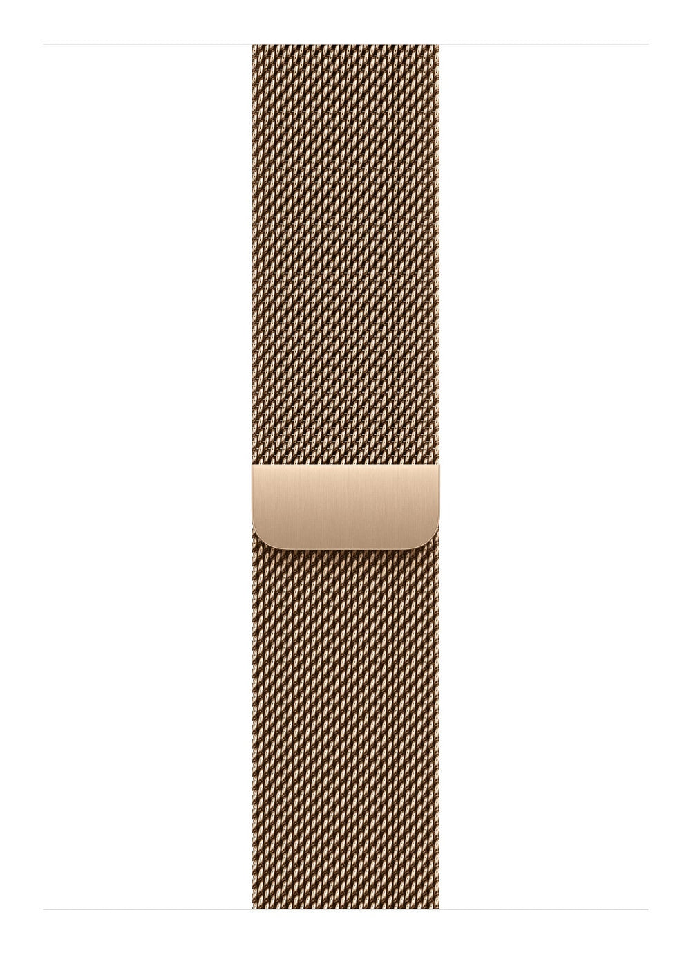 Band. Compatible device type: Smartwatch Apple. Material: Stainless steel. Gold. 1 pc(s). A modern interpretation of a design developed in Milan at the end of the 19th century. Woven on specialised Italian machines, the smooth stainless steel mesh wraps fluidly around your wrist. And because it’s fully magnetic, the Milanese Loop is infinitely adjustable, ensuring a perfect fit. An additional physical vapour deposition (PVD) layer gives the stainless steel its distinctive finish.. The Milanese Loop contains 80% recycled stainless steel mesh and 100% recycled rare earth elements in all magnets. 100% of the manufacturing electricity is covered by clean energy.. Features. Clasp type. Magnetic clasp. Band size. M/L. Buckle colour. Gold. Material. Stainless steel. Compatibility. Apple Watch 44/45/46/49mm. Brand compatibility. Apple. Product colour. Gold. Compatible device type. Smartwatch. Product type. Band. Weight & dimensions. Wrist size range. 150 - 200 mm. Width. 46 mm. Packaging content. Quantity per pack. 1 pc(s)