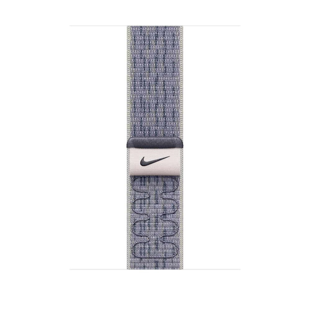 Band. Compatible device type: Smartwatch Apple. Material: Nylon. Blue, Grey. 1 pc(s). The Nike Sport Loop has been redesigned to use excess yarn from previous seasons to create a soft, breathable and lightweight strap with a bold pattern. The hook-and-loop fastener and a woven pull tab featuring the Nike Swoosh makes it easy to adjust on the go. The double-layer nylon weave has dense loops on the skin side that provide soft cushioning while allowing moisture to escape.. The Nike Sport Loop contains at least 68% excess yarn from previous seasons, saving over three tonnes of primary yarn.. Features. Clasp type. Hook-and-loop clasp. Band size. One Size. Material. Nylon. Compatibility. Apple Watch Models44mm45mm46mm49mm. Brand compatibility. Apple. Product colour. Blue, Grey. Compatible device type. Smartwatch. Product type. Band. Packaging content. Quantity per pack. 1 pc(s)