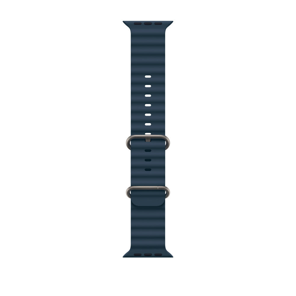 Band. Compatible device type: Smartwatch Apple. Material: Fluoroelastomer, Titanium. Blue. 1 pc(s). The Ocean Band is moulded in a high-performance elastomer with a tubular geometry allowing it to stretch for a perfect fit, even over a wetsuit. The corrosion-resistant titanium buckle and adjustable loop secure the strap during high-speed water sports.. For extra length, an extension strap is sold separately — perfect if you need extra length to wear the strap over your wetsuit.. Features. Material. Fluoroelastomer, Titanium. Compatibility. Apple Watch 44mm, 45mm, 49mm. Brand compatibility. Apple. Product colour. Blue. Compatible device type. Smartwatch. Product type. Band. Packaging content. Quantity per pack. 1 pc(s)