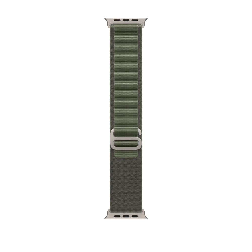 Band. Compatible device type: Smartwatch Apple. Material: Polyester. Green. 1 pc(s). The rugged Alpine Loop is made from two textile layers woven together into one continuous piece without stitching, with a titanium G-hook to ensure a secure fit.. Features. Band size. M. Material. Polyester. Compatibility. Watch 44mmWatch 45mmWatch 49mm. Brand compatibility. Apple. Product colour. Green. Compatible device type. Smartwatch. Product type. Band. Weight & dimensions. Wrist size range. 145 - 190 mm. Packaging content. Quantity per pack. 1 pc(s)
