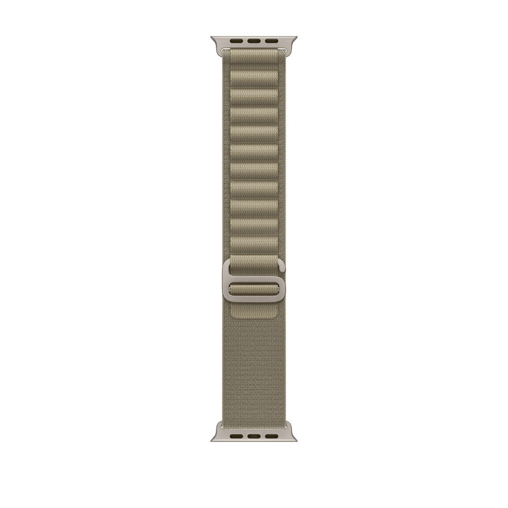 Band. Compatible device type: Smartwatch Apple. Material: Recycled polyester, Titanium, Spandex. Olive. 1 pc(s). The rugged Alpine Loop is made from two textile layers woven together into one continuous piece without stitching. High-strength yarns reinforce the top loops, and the corrosion-resistant titanium G-hook slides easily into the loops for secure fit.. This strap is carbon neutral. The Alpine Loop contains 43% recycled content by weight, 100% of manufacturing electricity is covered by clean energy, and 50% or more of all carbon-neutral Apple Watch products are shipped without aeroplanes.. Features. Band size. L. Material. Recycled polyester, Titanium, Spandex. Compatibility. Apple Watch 44mm, 45mm, 49mm. Brand compatibility. Apple. Product colour. Olive. Compatible device type. Smartwatch. Product type. Band. Weight & dimensions. Wrist size range. 165 - 210 mm. Packaging content. Quantity per pack. 1 pc(s)