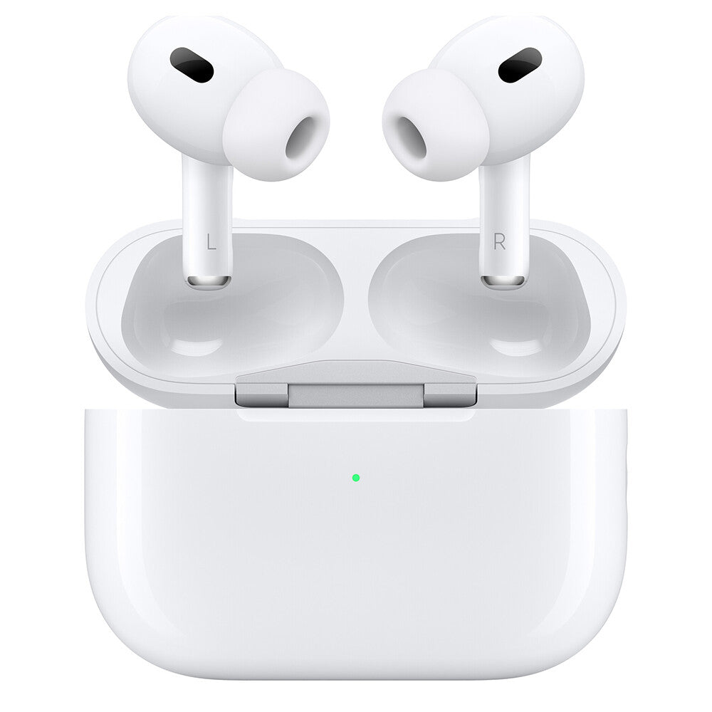Designed by Apple. H2 Apple silicon, amazing sound quality with Adaptive EQ. Adaptive Audio. Active Noise Cancellation. Transparency mode. Conversation Awareness. Personalized Volume. Personalized Spatial Audio with dynamic head tracking. Four silicone ear tip sizes for a more customizable fit and seal. Touch control lets you adjust volume with a swipe and manage playback functions from the stem. MagSafe Charging Case with Precision Finding, built-in speaker, and lanyard loop. Up to 6 hours of listening time with Active Noise Cancellation enabled. Up to 30 hours of total listening time with Active Noise Cancellation enabled, using the case.¹⁰. AirPods Pro and charging case are dust, sweat, and water resistant (IP54). Automatically on, automatically connected. Easy setup for all your Apple devices. MagSafe Charging Case can be charged with with USB-C, Apple Watch, MagSafe, or Qi wireless chargers. Rebuilt from the sound up. AirPods Pro (2nd generation) with MagSafe Charging Case (USB-C) deliver up to 2x more Active Noise Cancellation than the previous generation, with Transparency mode that enables you to hear the world around you. All-new Adaptive Audio that dynamically tailors noise control to your environment. Conversation Awareness helps lower media volume and enhance the voices in front of you while you’re interacting with others. A single charge delivers up to 6 hours of battery life. And Touch control lets you easily adjust volume with a swipe. The MagSafe Charging Case is a marvel on its own with Precision Finding, built-in speaker, and lanyard loop.. Superior audio quality. The upgraded H2 chip powers smarter noise cancellation and three-dimensional sound. Adaptive EQ tunes music to your ears in real time to deliver crisp, clean high notes and deep, rich bass in stunning clarity.. Intelligent sound. Active Noise Cancellation removes twice as much unwanted noise, so nothing interrupts your listening during a commute and when you need to focus. Transparency mode reduces and adjusts down the intensity of loud noises at 48,000 times per second, so you can comfortably hear the world around you. And Adaptive Audio dynamically blends Transparency mode with Active Noise Cancellation to deliver the best listening experience for you in any environment.. Personalized listening. A listening experience all your own. Pick from four sizes of flexible silicone ear tips (XS, S, M, L) for an ideal acoustic seal and fit. Personalized Volume adjusts sound to your listening preferences over time and in different environments. Conversation Awareness automatically lowers the volume of what’s playing, enhances voices in front of you, and reduces background noise.¹⁶ Personalized Spatial Audio with dynamic head tracking tailors the listening experience by precisely placing sound elements in the space around you.ᴼ Adaptive EQ tunes music to your ears, so you hear consistently detailed playback, every time.. Expanded battery life. Enjoy up to 6 hours of listening time on a single charge, and up to 30 hours of listening time with the MagSafe Charging Case. Recharge the MagSafe Charging Case with an Apple Watch or MagSafe charger. You can also use a USB-C connector or a Qi‑certified charger.. Powerful charging case. The MagSafe Charging Case includes the U1 chip with Precision Finding to help you identify the location of your case. And if you’re nearby but you can’t find it, you can play a sound from the built-in speaker. A built-in lanyard loop˄ lets you attach your case to a backpack or handbag, so it’s always within reach. And both AirPods Pro and the MagSafe Charging Case are built to brave the elements, with IP54 dust, sweat, and water resistance.. More magical than ever. AirPods Pro (2nd generation) with MagSafe Charging Case (USB-C) deliver an even more effortless experience than the original model. Touch control lets you manage playback functions from the stem and adjust volume with a light swipe up or down. Have Siri read your important messages and alerts as they arrive with Announce Notifications. Easily share a song or show between any two sets of AirPods with Audio Sharing. And as always, AirPods Pro magically connect to your iPhone or Apple Watch, and sound moves seamlessly when you switch between your favourite Apple devices.. Performance. Audio chip. Apple H2. Accelerometer. Yes. BeamForming. Yes. International Protection (IP) code. IPX4. Protection features. Sweat resistant, Water resistant. Control type. Touch. Volume control. Touch. Product colour. White. Headset type. Binaural. Recommended usage. Calls/Music. Wearing style. In-ear. Product type. Headphones. Ports & interfaces. RF connectivity. No. Bluetooth version. 5.3. Bluetooth. Yes. USB connectivity. No. 6.35 mm connector. No. 3.5 mm connector. No. Connectivity technology. Wireless. Headphones. Transparency mode. Yes. Noise canceling type. Active. Noise canceling. Yes. Ear coupling. Intraaural. Intraaural headphones type. Earbuds. Microphone. Microphone noise-canceling. Yes. Microphone type. Built-in. Battery. Talk time. 4.5 h. Continuous audio playback time (with charging case). 30 h. Talk time (with charging case). 24 h. Continuous audio playback time. 6 h. Battery operated. Yes. System requirements. Mobile operating systems supported. iOS, iPadOS. Mac operating systems supported. MacOS. Weight & dimensions. Charging case weight. 50.8 g. Charging case dimensions (W x D x H). 60.6 x 21.7 x 45.2 mm. Right earpiece weight. 5.3 g. Left earpiece weight. 5.3 g. Packaging content. Accessories included in set. 4 sizes silicone eartips. Cables included. USB Type-C to USB Type-C. Audio adapters included. No. Charging case connector type. USB Type-C. Charging case type. Wired & Wireless. Charging case. Yes. General. Product family. AirPods Pro (2nd generation). AirPods Pro | Adaptive Audio. Now playing. | Apple