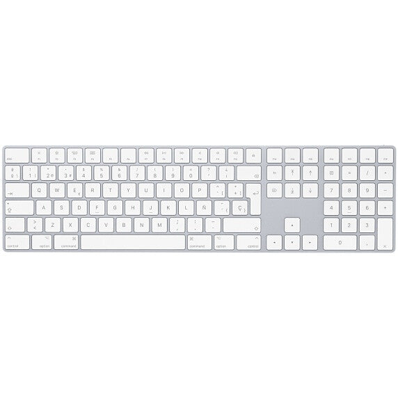 Universal. Bluetooth. QWERTY Spanish. Full-size (100%) Numeric keypad. White. Magic Keyboard with Numeric Keypad features an extended layout, with document navigation controls for quick scrolling and full-size arrow keys for gaming. A scissor mechanism beneath each key allows for increased stability, while optimised key travel and a low profile provide a comfortable and precise typing experience. The numeric keypad is also great for spreadsheets and finance applications. And the built-in, rechargeable battery is incredibly long-lasting, powering your keyboard for about a month or more between charges.1. Keyboard. Purpose. Universal. USB hub. No. Multimedia keys. Yes. Numeric keypad. Yes. Keyboard form factor. Full-size (100%). Pointing device. No. Keyboard language. Spanish. Keyboard layout. QWERTY. Device interface. Bluetooth. Connectivity technology. Wired & Wireless. Recommended usage. Universal. Design. Surface coloration. Monochromatic. Product colour. White. Wrist rest. No. Full-size keyboard. Yes. Keyboard style. Straight. Backlight. No. Power. Power source type. Battery. Mouse. Mouse included. No. Weight & dimensions. Keyboard weight. 390 g. Keyboard dimensions (WxDxH). 418.7 x 114.9 x 10.9 mm. Logistics data. Harmonized System (HS) code. 84716060