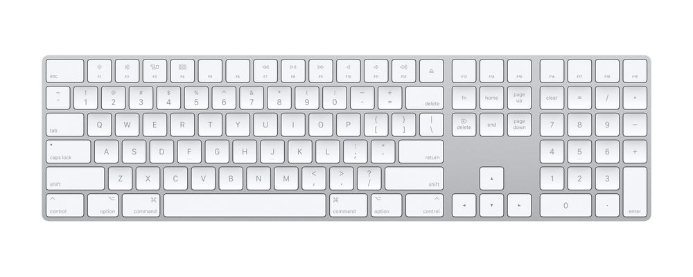 Universal. Bluetooth. QWERTZ Hungarian. Full-size (100%) Numeric keypad. White. Magic Keyboard with Numeric Keypad features an extended layout, with document navigation controls for quick scrolling and full-size arrow keys for gaming. A scissor mechanism beneath each key allows for increased stability, while optimised key travel and a low profile provide a comfortable and precise typing experience. The numeric keypad is also great for spreadsheets and finance applications. And the built-in, rechargeable battery is incredibly long-lasting, powering your keyboard for about a month or more between charges.1. Keyboard. Purpose. Universal. USB hub. No. Multimedia keys. Yes. Numeric keypad. Yes. Keyboard form factor. Full-size (100%). Pointing device. No. Keyboard language. Hungarian. Keyboard layout. QWERTZ. Device interface. Bluetooth. Connectivity technology. Wired & Wireless. Recommended usage. Universal. Design. Surface coloration. Monochromatic. Product colour. White. Wrist rest. No. Keyboard style. Straight. Backlight. No. Power. Power source type. Battery. Mouse. Mouse included. No. Weight & dimensions. Keyboard weight. 390 g. Keyboard dimensions (WxDxH). 418.7 x 114.9 x 10.9 mm. Logistics data. Harmonized System (HS) code. 84716060