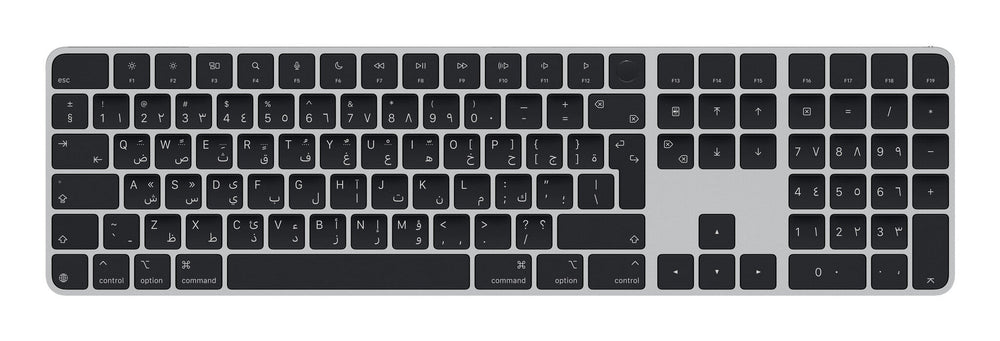 Universal. USB + Bluetooth. QWERTY Arabic. Numeric keypad. Black. 1 pc(s). Magic Keyboard is available with Touch ID, providing fast, easy and secure authentication for logins and to unlock your Mac.. Magic Keyboard with Touch ID and Numeric Keypad delivers a remarkably comfortable and precise typing experience. It features an extended layout, with document navigation controls for quick scrolling and full-size arrow keys, which are great for gaming. The numeric keypad is also ideal for spreadsheets and finance applications. It’s wireless and features a rechargeable battery that will power your keyboard for about a month or more between charges. It pairs automatically with your Mac, so you can get to work straightaway.. It features a USB-C port and includes a woven USB-C Charge Cable that lets you pair and charge by connecting to a USB-C port on your Mac, so you can charge all of your favorite devices with just a single cable.. Keyboard. Fingerprint reader. Yes. Multimedia keys. Yes. Numeric keypad. Yes. Pointing device. No. Keyboard language. Arabic. Keyboard layout. QWERTY. Device interface. USB + Bluetooth. Connectivity technology. Wired & Wireless. Recommended usage. Universal. Design. Product colour. Black. Features. USB connector type. USB Type-C. Power. Required charging power (min). 2.5 W. Required charging power (max). 2.5 W. USB Type-C charging port. Yes. USB Power Delivery (USB PD). No. Charging source. USB Type-C. Keyboard battery type. Built-in battery. Power source type. Battery, USB. Mouse. Mouse included. No. System requirements. Mac operating systems supported. Mac OS X, MacOS. Weight & dimensions. Keyboard weight. 369 g. Keyboard dimensions (WxDxH). 418.7 x 114.9 x 10.9 mm. Packaging content. Cables included. USB Type-C. Number of products included. 1 pc(s). Other features. Compatibility. MacBook Air (13-inch, M3, 2024)MacBook Air (15-inch, M3, 2024)MacBook Air (15-inch, M2, 2023)MacBook Air (13-inch, M2, 2022)MacBook Air (M1, 2020)MacBook Pro (14‑inch, 2023)MacBook Pro (16‑inch, 2023)MacBook Pro (13‑inch, M2, 2022)MacBook Pro (14‑inch, 2021)MacBook Pro (16-inch, 2021)MacBook Pro (13-inch, M1, 2020)iMac (24‑inch, M4, 2024)iMac (24-inch, M3, 2023)iMac (24-inch, M1, 2021)Mac Studio (2023)Mac Studio (2022)Mac mini (2023)Mac mini (M1, 2020)Mac Pro (2023)
