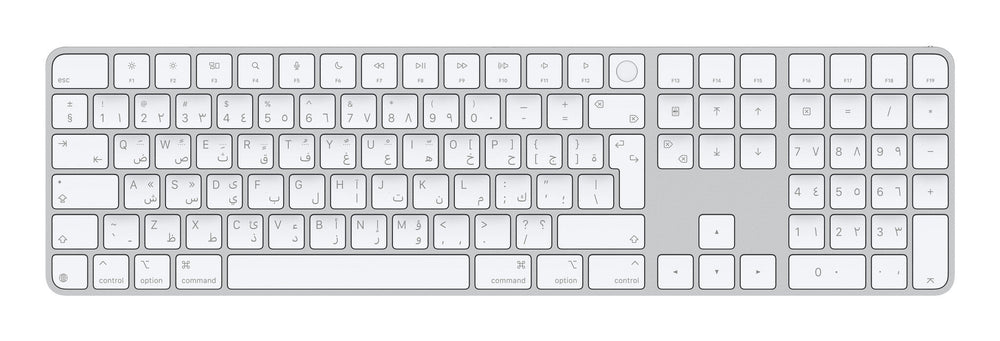 Universal. USB + Bluetooth. QWERTY Arabic. Numeric keypad. White. 1 pc(s). Magic Keyboard is available with Touch ID, providing fast, easy and secure authentication for logins and to unlock your Mac.. Magic Keyboard with Touch ID and Numeric Keypad delivers a remarkably comfortable and precise typing experience. It features an extended layout, with document navigation controls for quick scrolling and full-size arrow keys, which are great for gaming. The numeric keypad is also ideal for spreadsheets and finance applications. It’s wireless and features a rechargeable battery that will power your keyboard for about a month or more between charges. It pairs automatically with your Mac, so you can get to work straightaway.. It features a USB-C port and includes a woven USB-C Charge Cable that lets you pair and charge by connecting to a USB-C port on your Mac, so you can charge all of your favorite devices with just a single cable.. Keyboard. Fingerprint reader. Yes. Multimedia keys. Yes. Numeric keypad. Yes. Pointing device. No. Keyboard language. Arabic. Keyboard layout. QWERTY. Device interface. USB + Bluetooth. Connectivity technology. Wired & Wireless. Recommended usage. Universal. Design. Product colour. White. Features. USB connector type. USB Type-C. Power. Required charging power (min). 2.5 W. Required charging power (max). 2.5 W. USB Type-C charging port. Yes. USB Power Delivery (USB PD). No. Charging source. USB Type-C. Keyboard battery type. Built-in battery. Power source type. Battery, USB. Mouse. Mouse included. No. System requirements. Mac operating systems supported. Mac OS X, MacOS. Weight & dimensions. Keyboard weight. 369 g. Keyboard dimensions (WxDxH). 418.7 x 114.9 x 10.9 mm. Packaging content. Cables included. USB Type-C. Number of products included. 1 pc(s). Other features. Compatibility. MacBook Air (13-inch, M3, 2024)MacBook Air (15-inch, M3, 2024)MacBook Air (15-inch, M2, 2023)MacBook Air (13-inch, M2, 2022)MacBook Air (M1, 2020)MacBook Pro (14‑inch, 2023)MacBook Pro (16‑inch, 2023)MacBook Pro (13‑inch, M2, 2022)MacBook Pro (14‑inch, 2021)MacBook Pro (16-inch, 2021)MacBook Pro (13-inch, M1, 2020)iMac (24‑inch, M4, 2024)iMac (24-inch, M3, 2023)iMac (24-inch, M1, 2021)Mac Studio (2023)Mac Studio (2022)Mac mini (2023)Mac mini (M1, 2020)Mac Pro (2023)