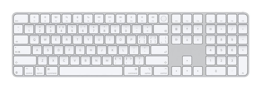 Universal. USB + Bluetooth. QWERTY Chinese Pinyin. Numeric keypad. White. 1 pc(s). Magic Keyboard is available with Touch ID, providing fast, easy and secure authentication for logins and to unlock your Mac.. Magic Keyboard with Touch ID and Numeric Keypad delivers a remarkably comfortable and precise typing experience. It features an extended layout, with document navigation controls for quick scrolling and full-size arrow keys, which are great for gaming. The numeric keypad is also ideal for spreadsheets and finance applications. It’s wireless and features a rechargeable battery that will power your keyboard for about a month or more between charges. It pairs automatically with your Mac, so you can get to work straightaway.. It features a USB-C port and includes a woven USB-C Charge Cable that lets you pair and charge by connecting to a USB-C port on your Mac, so you can charge all of your favorite devices with just a single cable.. Keyboard. Fingerprint reader. Yes. Multimedia keys. Yes. Numeric keypad. Yes. Pointing device. No. Keyboard language. Chinese Pinyin. Keyboard layout. QWERTY. Device interface. USB + Bluetooth. Connectivity technology. Wired & Wireless. Recommended usage. Universal. Design. Product colour. White. Features. USB connector type. USB Type-C. Power. Required charging power (min). 2.5 W. Required charging power (max). 2.5 W. USB Type-C charging port. Yes. USB Power Delivery (USB PD). No. Charging source. USB Type-C. Keyboard battery type. Built-in battery. Power source type. Battery, USB. Mouse. Mouse included. No. System requirements. Mac operating systems supported. Mac OS X, MacOS. Weight & dimensions. Keyboard weight. 369 g. Keyboard dimensions (WxDxH). 418.7 x 114.9 x 10.9 mm. Packaging content. Cables included. USB Type-C. Number of products included. 1 pc(s). Other features. Compatibility. MacBook Air (13-inch, M3, 2024)MacBook Air (15-inch, M3, 2024)MacBook Air (15-inch, M2, 2023)MacBook Air (13-inch, M2, 2022)MacBook Air (M1, 2020)MacBook Pro (14‑inch, 2023)MacBook Pro (16‑inch, 2023)MacBook Pro (13‑inch, M2, 2022)MacBook Pro (14‑inch, 2021)MacBook Pro (16-inch, 2021)MacBook Pro (13-inch, M1, 2020)iMac (24‑inch, M4, 2024)iMac (24-inch, M3, 2023)iMac (24-inch, M1, 2021)Mac Studio (2023)Mac Studio (2022)Mac mini (2023)Mac mini (M1, 2020)Mac Pro (2023)