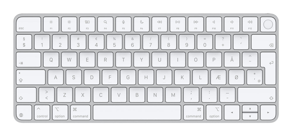 Universal. USB + Bluetooth. QWERTY Danish. White. Magic Keyboard is available with Touch ID, providing fast, easy and secure authentication for logins and to unlock your Mac.. Magic Keyboard with Touch ID delivers a remarkably comfortable and precise typing experience. It’s also wireless and rechargeable, with an incredibly long-lasting internal battery that will power your keyboard for about a month or more between charges. It pairs automatically with your Mac, so you can get to work straightaway.. It features a USB-C port and includes a woven USB-C Charge Cable that lets you pair and charge by connecting to a USB-C port on your Mac, so you can charge all of your favorite devices with just a single cable.. Keyboard. Fingerprint reader. Yes. Multimedia keys. Yes. Numeric keypad. No. Pointing device. No. Keyboard language. Danish. Keyboard layout. QWERTY. Device interface. USB + Bluetooth. Connectivity technology. Wired & Wireless. Recommended usage. Universal. Design. Product colour. White. Features. USB connector type. USB Type-C. Power. Required charging power (min). 2.5 W. Required charging power (max). 2.5 W. USB Type-C charging port. Yes. USB Power Delivery (USB PD). No. Charging source. USB Type-C. Keyboard battery type. Built-in battery. Power source type. Battery, USB. Mouse. Mouse included. No. System requirements. Mac operating systems supported. Mac OS X, MacOS. Weight & dimensions. Keyboard weight. 243 g. Keyboard dimensions (WxDxH). 278.9 x 114.9 x 10.9 mm. Packaging content. Cables included. USB Type-C. Other features. Compatibility. MacBook Air (13-inch, M3, 2024)MacBook Air (15-inch, M3, 2024)MacBook Air (15-inch, M2, 2023)MacBook Air (13-inch, M2, 2022)MacBook Air (M1, 2020)MacBook Pro (14‑inch, 2023)MacBook Pro (16‑inch, 2023)MacBook Pro (13‑inch, M2, 2022)MacBook Pro (14‑inch, 2021)MacBook Pro (16-inch, 2021)MacBook Pro (13-inch, M1, 2020)iMac (24‑inch, M4, 2024)iMac (24-inch, M3, 2023)iMac (24-inch, M1, 2021)Mac Studio (2023)Mac Studio (2022)Mac mini (2023)Mac mini (M1, 2020)Mac Pro (2023)