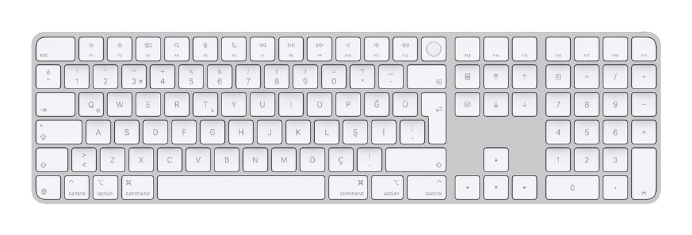 Universal. USB + Bluetooth. QWERTY Turkish. Numeric keypad. White. 1 pc(s). Magic Keyboard is available with Touch ID, providing fast, easy and secure authentication for logins and to unlock your Mac.. Magic Keyboard with Touch ID and Numeric Keypad delivers a remarkably comfortable and precise typing experience. It features an extended layout, with document navigation controls for quick scrolling and full-size arrow keys, which are great for gaming. The numeric keypad is also ideal for spreadsheets and finance applications. It’s wireless and features a rechargeable battery that will power your keyboard for about a month or more between charges. It pairs automatically with your Mac, so you can get to work straightaway.. It features a USB-C port and includes a woven USB-C Charge Cable that lets you pair and charge by connecting to a USB-C port on your Mac, so you can charge all of your favorite devices with just a single cable.. Keyboard. Fingerprint reader. Yes. Multimedia keys. Yes. Numeric keypad. Yes. Pointing device. No. Keyboard language. Turkish. Keyboard layout. QWERTY. Device interface. USB + Bluetooth. Connectivity technology. Wired & Wireless. Recommended usage. Universal. Design. Product colour. White. Features. USB connector type. USB Type-C. Power. Required charging power (min). 2.5 W. Required charging power (max). 2.5 W. USB Type-C charging port. Yes. USB Power Delivery (USB PD). No. Charging source. USB Type-C. Keyboard battery type. Built-in battery. Power source type. Battery, USB. Mouse. Mouse included. No. System requirements. Mac operating systems supported. Mac OS X, MacOS. Weight & dimensions. Keyboard weight. 369 g. Keyboard dimensions (WxDxH). 418.7 x 114.9 x 10.9 mm. Packaging content. Cables included. USB Type-C. Number of products included. 1 pc(s). Other features. Compatibility. MacBook Air (13-inch, M3, 2024)MacBook Air (15-inch, M3, 2024)MacBook Air (15-inch, M2, 2023)MacBook Air (13-inch, M2, 2022)MacBook Air (M1, 2020)MacBook Pro (14‑inch, 2023)MacBook Pro (16‑inch, 2023)MacBook Pro (13‑inch, M2, 2022)MacBook Pro (14‑inch, 2021)MacBook Pro (16-inch, 2021)MacBook Pro (13-inch, M1, 2020)iMac (24‑inch, M4, 2024)iMac (24-inch, M3, 2023)iMac (24-inch, M1, 2021)Mac Studio (2023)Mac Studio (2022)Mac mini (2023)Mac mini (M1, 2020)Mac Pro (2023)