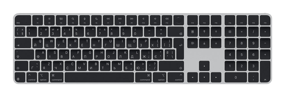 Universal. USB + Bluetooth. QWERTY Ukrainian. Numeric keypad. Black. 1 pc(s). Magic Keyboard is available with Touch ID, providing fast, easy and secure authentication for logins and to unlock your Mac.. Magic Keyboard with Touch ID and Numeric Keypad delivers a remarkably comfortable and precise typing experience. It features an extended layout, with document navigation controls for quick scrolling and full-size arrow keys, which are great for gaming. The numeric keypad is also ideal for spreadsheets and finance applications. It’s wireless and features a rechargeable battery that will power your keyboard for about a month or more between charges. It pairs automatically with your Mac, so you can get to work straightaway.. It features a USB-C port and includes a woven USB-C Charge Cable that lets you pair and charge by connecting to a USB-C port on your Mac, so you can charge all of your favorite devices with just a single cable.. Keyboard. Fingerprint reader. Yes. Multimedia keys. Yes. Numeric keypad. Yes. Pointing device. No. Keyboard language. Ukrainian. Keyboard layout. QWERTY. Device interface. USB + Bluetooth. Connectivity technology. Wired & Wireless. Recommended usage. Universal. Design. Product colour. Black. Features. USB connector type. USB Type-C. Power. Required charging power (min). 2.5 W. Required charging power (max). 2.5 W. USB Type-C charging port. Yes. USB Power Delivery (USB PD). No. Charging source. USB Type-C. Keyboard battery type. Built-in battery. Power source type. Battery, USB. Mouse. Mouse included. No. System requirements. Mac operating systems supported. Mac OS X, MacOS. Weight & dimensions. Keyboard weight. 369 g. Keyboard dimensions (WxDxH). 418.7 x 114.9 x 10.9 mm. Packaging content. Cables included. USB Type-C. Number of products included. 1 pc(s). Other features. Compatibility. MacBook Air (13-inch, M3, 2024)MacBook Air (15-inch, M3, 2024)MacBook Air (15-inch, M2, 2023)MacBook Air (13-inch, M2, 2022)MacBook Air (M1, 2020)MacBook Pro (14‑inch, 2023)MacBook Pro (16‑inch, 2023)MacBook Pro (13‑inch, M2, 2022)MacBook Pro (14‑inch, 2021)MacBook Pro (16-inch, 2021)MacBook Pro (13-inch, M1, 2020)iMac (24‑inch, M4, 2024)iMac (24-inch, M3, 2023)iMac (24-inch, M1, 2021)Mac Studio (2023)Mac Studio (2022)Mac mini (2023)Mac mini (M1, 2020)Mac Pro (2023)