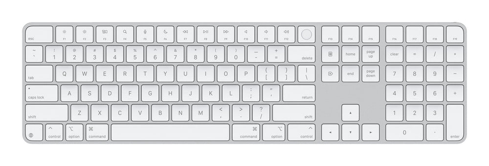 Universal. USB + Bluetooth. QWERTY US English. Numeric keypad. White. 1 pc(s). Magic Keyboard is available with Touch ID, providing fast, easy and secure authentication for logins and to unlock your Mac.. Magic Keyboard with Touch ID and Numeric Keypad delivers a remarkably comfortable and precise typing experience. It features an extended layout, with document navigation controls for quick scrolling and full-size arrow keys, which are great for gaming. The numeric keypad is also ideal for spreadsheets and finance applications. It’s wireless and features a rechargeable battery that will power your keyboard for about a month or more between charges. It pairs automatically with your Mac, so you can get to work straightaway.. It features a USB-C port and includes a woven USB-C Charge Cable that lets you pair and charge by connecting to a USB-C port on your Mac, so you can charge all of your favorite devices with just a single cable.. Keyboard. Fingerprint reader. Yes. Multimedia keys. Yes. Numeric keypad. Yes. Pointing device. No. Keyboard language. US English. Keyboard layout. QWERTY. Device interface. USB + Bluetooth. Connectivity technology. Wired & Wireless. Recommended usage. Universal. Design. Product colour. White. Features. USB connector type. USB Type-C. Power. Required charging power (min). 2.5 W. Required charging power (max). 2.5 W. USB Type-C charging port. Yes. USB Power Delivery (USB PD). No. Charging source. USB Type-C. Keyboard battery type. Built-in battery. Power source type. Battery, USB. Mouse. Mouse included. No. System requirements. Mac operating systems supported. Mac OS X, MacOS. Weight & dimensions. Keyboard weight. 369 g. Keyboard dimensions (WxDxH). 418.7 x 114.9 x 10.9 mm. Packaging content. Cables included. USB Type-C. Number of products included. 1 pc(s). Other features. Compatibility. MacBook Air (13-inch, M3, 2024)MacBook Air (15-inch, M3, 2024)MacBook Air (15-inch, M2, 2023)MacBook Air (13-inch, M2, 2022)MacBook Air (M1, 2020)MacBook Pro (14‑inch, 2023)MacBook Pro (16‑inch, 2023)MacBook Pro (13‑inch, M2, 2022)MacBook Pro (14‑inch, 2021)MacBook Pro (16-inch, 2021)MacBook Pro (13-inch, M1, 2020)iMac (24‑inch, M4, 2024)iMac (24-inch, M3, 2023)iMac (24-inch, M1, 2021)Mac Studio (2023)Mac Studio (2022)Mac mini (2023)Mac mini (M1, 2020)Mac Pro (2023)