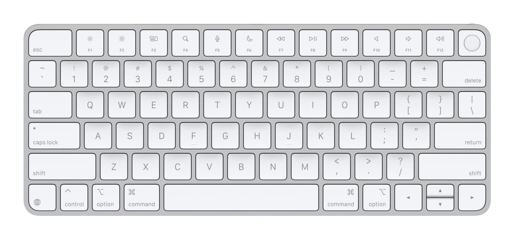 Universal. USB + Bluetooth. QWERTY US English. Tenkeyless (80 - 87%). Adjustable keyboard height. Silver, White. 1 pc(s). Magic Keyboard is available with Touch ID, providing fast, easy and secure authentication for logins and to unlock your Mac.. Magic Keyboard with Touch ID delivers a remarkably comfortable and precise typing experience. It’s also wireless and rechargeable, with an incredibly long-lasting internal battery that will power your keyboard for about a month or more between charges. It pairs automatically with your Mac, so you can get to work straightaway.. It features a USB-C port and includes a woven USB-C Charge Cable that lets you pair and charge by connecting to a USB-C port on your Mac, so you can charge all of your favorite devices with just a single cable.. Keyboard. Fingerprint reader. Yes. Multimedia keys. Yes. Numeric keypad. No. Keyboard form factor. Tenkeyless (80 - 87%). Pointing device. No. Keyboard language. US English. Keyboard layout. QWERTY. Device interface. USB + Bluetooth. Connectivity technology. Wired & Wireless. Recommended usage. Universal. Design. Product colour. Silver, White. Adjustable keyboard height. Yes. Keyboard style. Straight. Features. USB connector type. USB Type-C. Power. Required charging power (min). 2.5 W. Required charging power (max). 2.5 W. USB Type-C charging port. Yes. USB Power Delivery (USB PD). No. Charging source. USB Type-C. Rechargeable. Yes. Keyboard battery type. Built-in battery. Power source type. Battery, USB. Mouse. Mouse included. No. System requirements. Mac operating systems supported. Mac OS X 11.0 Big Sur, Mac OS X 12.0 Monterey, Mac OS X 13.0 Ventura, Mac OS X 14.0 Sonoma. Weight & dimensions. Keyboard weight. 243 g. Keyboard dimensions (WxDxH). 278.9 x 114.9 x 10.9 mm. Packaging content. Number of products included. 1 pc(s)