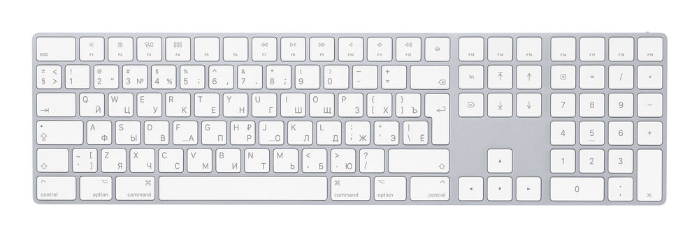 Universal. Bluetooth Scissor key switch. QWERTY Russian. Full-size (100%) Numeric keypad. Silver, White. 1 pc(s). Magic Keyboard with Numeric Keypad features an extended layout, with document navigation controls for quick scrolling and full-size arrow keys for gaming. A scissor mechanism beneath each key allows for increased stability, while optimised key travel and a low profile provide a comfortable and precise typing experience. The numeric keypad is also great for spreadsheets and finance applications. And the built-in, rechargeable battery is incredibly long-lasting, powering your keyboard for about a month or more between charges.. Keyboard. Multimedia keys. Yes. Numeric keypad. Yes. Keyboard form factor. Full-size (100%). Pointing device. No. Keyboard language. Russian. Keyboard layout. QWERTY. Keyboard key switch. Scissor key switch. Device interface. Bluetooth. Connectivity technology. Wired & Wireless. Recommended usage. Universal. Design. Surface coloration. Monochromatic. Product colour. Silver, White. Keyboard style. Straight. Backlight. No. Power. Rechargeable. Yes. Power source type. Battery. Mouse. Mouse included. No. Weight & dimensions. Keyboard weight. 390 g. Keyboard dimensions (WxDxH). 418.7 x 114.9 x 10.9 mm. Packaging content. AC adapter included. No. Number of products included. 1 pc(s). Other features. Compatibility. iPhone 16 Pro; iPhone 16 Pro Max; iPhone 16; iPhone 16 Plus; iPhone 16e; iPhone 15 Pro; iPhone 15 Pro Max; iPhone 15; iPhone 15 Plus; iPhone 14 Pro; iPhone 14 Pro Max; iPhone 14; iPhone 14 Plus; iPhone 13 Pro; iPhone 13 Pro Max; iPhone 13 mini; iPhone 13; iPad Pro 13-inch (M4); iPad Pro 12.9-inch (6th generation); iPad Pro 12.9-inch (5th generation); iPad Pro 12.9-inch (4th generation); iPad Pro 12.9-inch (3rd generation); iPad Pro 11-inch (M4); iPad Pro 11-inch (4th generation); iPad Pro 11-inch (3rd generation); iPad Pro 11-inch (2nd generation); iPad Pro 11-inch (1st generation); iPad Pro 10.5-inch; iPad Pro 9.7-inch; iPad Air 13-inch (M2); iPad Air 11-inch (M2); iPad Air (5th generation); iPad Air (4th generation); iPad Air (3rd generation); iPad Air 2; iPad (10th generation); iPad (9th generation); iPad (8th generation); iPad (7th generation); iPad (6th generation); iPad (5th generation); iPad mini (A17 Pro); iPad mini (6th generation); iPad mini (5th generation); iPad mini 4; MacBook Air (13-inch, M3, 2024); MacBook Air (15-inch, M3, 2024); MacBook Air (15-inch, M2, 2023); MacBook Air (13-inch, M2, 2022); MacBook Air (M1, 2020); MacBook Air (Retina, 13‑inch, 2020); MacBook Air (Retina, 13-inch, 2018–2019); MacBook Pro (14‑inch, 2024); MacBook Pro (16‑inch, 2024); MacBook Pro (14‑inch, 2023); MacBook Pro (16‑inch, 2023); MacBook Pro (13‑inch, M2, 2022); MacBook Pro (14‑inch, 2021); MacBook Pro (16-inch, 2021); MacBook Pro (16-inch, 2019); MacBook Pro (13-inch, M1, 2020); MacBook Pro (13-inch, 2020); iMac (24‑inch, M4, 2024); iMac (24-inch, M3, 2023); iMac (24-inch, M1, 2021); iMac (Retina 4K, 21.5‑inch, 2019); iMac (Retina 5K, 27-inch, 2019–2020); iMac (Retina 5K, 27-inch, Late 2014 - 2015); iMac Pro (2017); Mac Studio (2023); Mac Studio (2022); Mac mini (2024); Mac mini (2023); Mac mini (M1, 2020); Mac mini (2018); Mac mini (Late 2014); Mac Pro (2023); Mac Pro (2019); iPod touch (7th generation); iPod touch (6th generation)