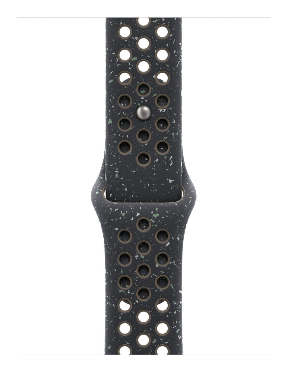 Band. Compatible device type: Smartwatch Apple. Material: Fluoroelastomer. Black. 1 pc(s). Made with compression-molded perforations for breathability, the Nike Sport Band is durable and strong, yet surprisingly soft. It features colourful flakes that create a randomized pattern, making each strap completely unique. The smooth, dense material drapes elegantly across your wrist and feels comfortable next to your skin. An aluminum pin-and-tuck closure gives the pin a fresh matte finish.. This strap contains at least 30% recycled fluoroelastomer, with each flake containing at least 66% recycled fluoroelastomer.. Features. Band size. M/L. Buckle material. Aluminium. Material. Fluoroelastomer. Compatibility. Apple Watch Models 38mm, 40mm, 41mm. Brand compatibility. Apple. Product colour. Black. Compatible device type. Smartwatch. Product type. Band. Weight & dimensions. Wrist size range. 150 - 200 mm. Packaging content. Quantity per pack. 1 pc(s)
