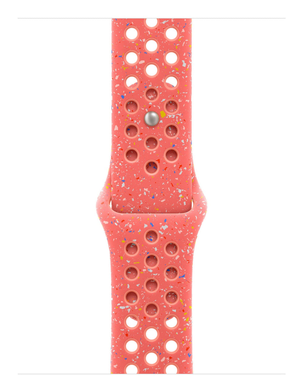 Band. Compatible device type: Smartwatch Apple. Material: Fluoroelastomer. Orange. 1 pc(s). Made with compression-molded perforations for breathability, the Nike Sport Band is durable and strong, yet surprisingly soft. It features colourful flakes that create a randomized pattern, making each strap completely unique. The smooth, dense material drapes elegantly across your wrist and feels comfortable next to your skin. An aluminum pin-and-tuck closure gives the pin a fresh matte finish.. This strap contains at least 30% recycled fluoroelastomer, with each flake containing at least 66% recycled fluoroelastomer.. Features. Band size. M/L. Buckle material. Aluminium. Material. Fluoroelastomer. Compatibility. Apple Watch Models 38mm, 40mm, 41mm. Brand compatibility. Apple. Product colour. Orange. Compatible device type. Smartwatch. Product type. Band. Weight & dimensions. Wrist size range. 150 - 200 mm. Packaging content. Quantity per pack. 1 pc(s)