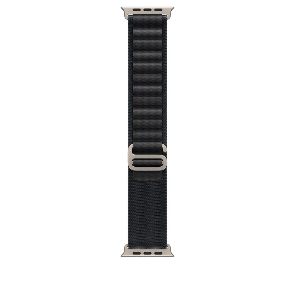 Band. Compatible device type: Smartwatch Apple. Material: Titanium, Polyester, Spandex. Black. 1 pc(s). The rugged Alpine Loop is made from two textile layers woven together into one continuous piece without stitching. High-strength yarns reinforce the top loops, and the corrosion-resistant titanium G-hook slides easily into the loops for secure fit.. Features. Clasp type. Hook-and-loop clasp. Band size. L. Material. Titanium, Polyester, Spandex. Compatibility. Apple Watch Models44mm45mm46mm49mm. Brand compatibility. Apple. Product colour. Black. Compatible device type. Smartwatch. Product type. Band. Weight & dimensions. Package weight. 66 g. Package height. 12.5 mm. Package depth. 211 mm. Package width. 115 mm. Wrist size range. 165 - 210 mm. Packaging content. Quantity per pack. 1 pc(s)