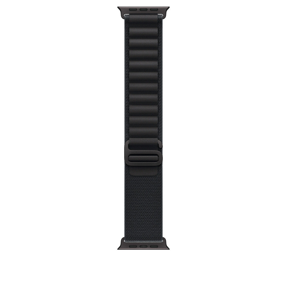 Band. Compatible device type: Smartwatch Apple. Material: Titanium, Polyester, Spandex. Black. 1 pc(s). The rugged Alpine Loop is made from two textile layers woven together into one continuous piece without stitching. High-strength yarns reinforce the top loops, and the corrosion-resistant titanium G-hook slides easily into the loops for secure fit.. Features. Clasp type. Hook-and-loop clasp. Band size. M. Material. Titanium, Polyester, Spandex. Compatibility. Apple Watch Models44mm45mm46mm49mm. Brand compatibility. Apple. Product colour. Black. Compatible device type. Smartwatch. Product type. Band. Weight & dimensions. Package weight. 66 g. Package height. 12.5 mm. Package depth. 211 mm. Package width. 115 mm. Wrist size range. 145 - 190 mm. Packaging content. Quantity per pack. 1 pc(s)