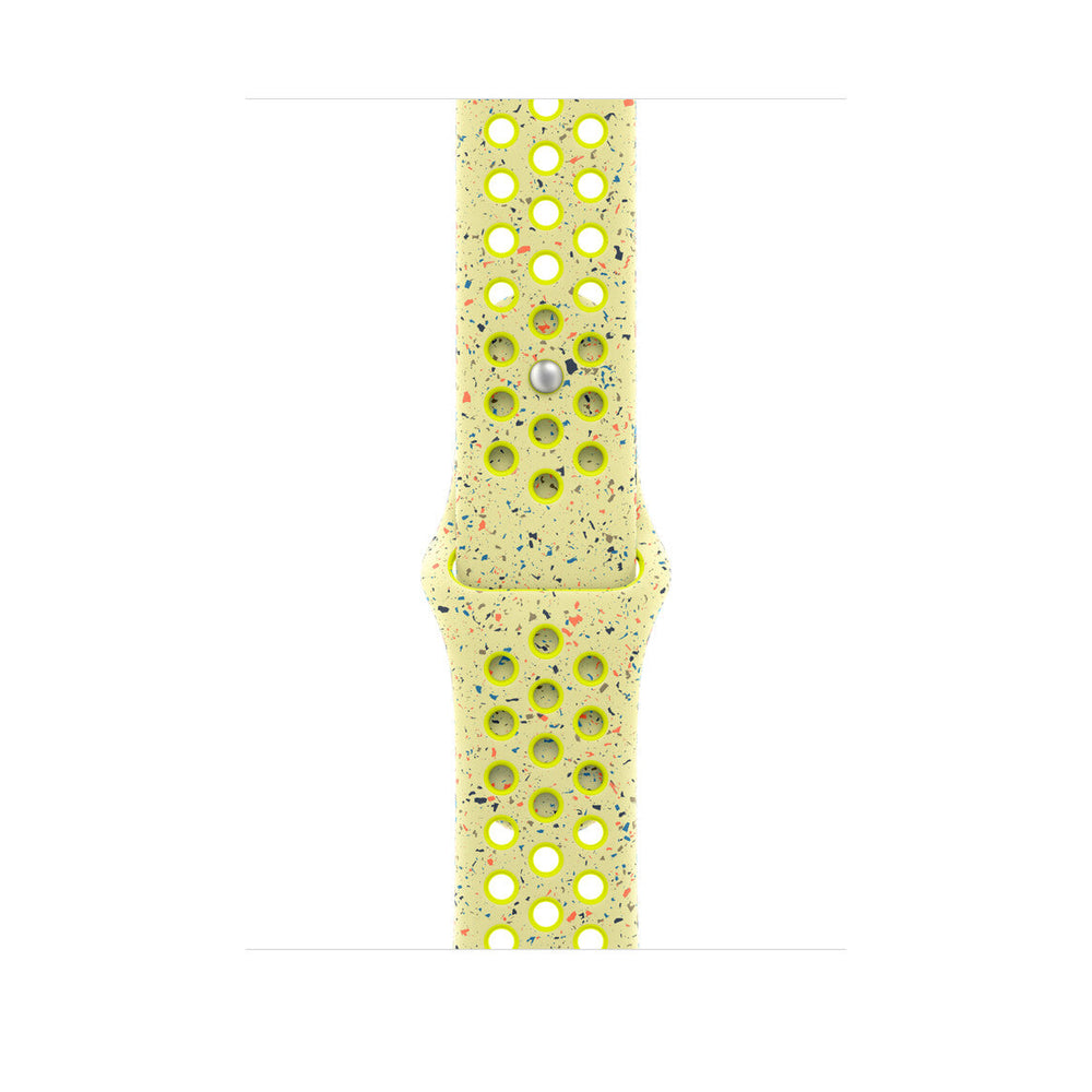 Band. Compatible device type: Smartwatch Apple. Material: Aluminium, Fluoroelastomer. Yellow. 1 pc(s). Made with compression-molded perforations for breathability, the Nike Sport Band is durable and strong, yet surprisingly soft. It features colorful flakes that create a randomized pattern, making each band unique. The smooth, dense material drapes elegantly across your wrist and feels comfortable next to your skin. An aluminum pin-and-tuck closure — carefully etched with the Run Swoosh logo — gives the pin a fresh matte finish.. Features. Band size. M/L. Material. Aluminium, Fluoroelastomer. Compatibility. Apple Watch Models44mm45mm46mm49mm. Brand compatibility. Apple. Product colour. Yellow. Compatible device type. Smartwatch. Product type. Band. Weight & dimensions. Package weight. 74 g. Package height. 12.5 mm. Package depth. 237 mm. Package width. 76 mm. Wrist size range. 160 - 210 mm. Packaging content. Quantity per pack. 1 pc(s)