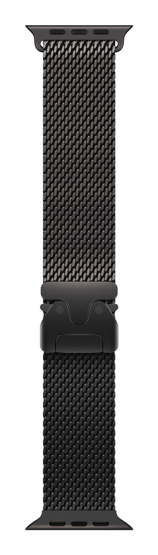 Band. Compatible device type: Smartwatch Apple. Material: Titanium. Black. 1 pc(s). Overview. The Titanium Milanese Loop features aerospace-grade titanium mesh with a secure parachute-style buckle. Inspired by stainless steel mesh historically used by divers and designed for ocean activities. Made of lightweight titanium, it’s perfect for any occasion.. Features. Band size. L. Buckle colour. Black. Material. Titanium. Compatibility. Apple Watch 44/45/46/49mm. Brand compatibility. Apple. Product colour. Black. Compatible device type. Smartwatch. Product type. Band. Weight & dimensions. Wrist size range. 180 - 210 mm. Width. 49 mm. Packaging content. Quantity per pack. 1 pc(s)