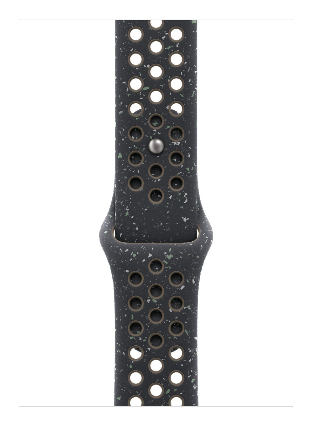 Band. Compatible device type: Smartwatch Apple. Material: Fluoroelastomer. Black. 1 pc(s). Made with compression-molded perforations for breathability, the Nike Sport Band is durable and strong, yet surprisingly soft. It features colourful flakes that create a randomized pattern, making each strap completely unique. The smooth, dense material drapes elegantly across your wrist and feels comfortable next to your skin. An aluminum pin-and-tuck closure gives the pin a fresh matte finish.. This strap contains at least 30% recycled fluoroelastomer, with each flake containing at least 66% recycled fluoroelastomer.. Features. Band size. M/L. Buckle material. Aluminium. Material. Fluoroelastomer. Compatibility. Apple Watch Models 44mm, 45mm, 46mm, 49mm. Brand compatibility. Apple. Product colour. Black. Compatible device type. Smartwatch. Product type. Band. Weight & dimensions. Wrist size range. 160 - 210 mm. Packaging content. Quantity per pack. 1 pc(s)