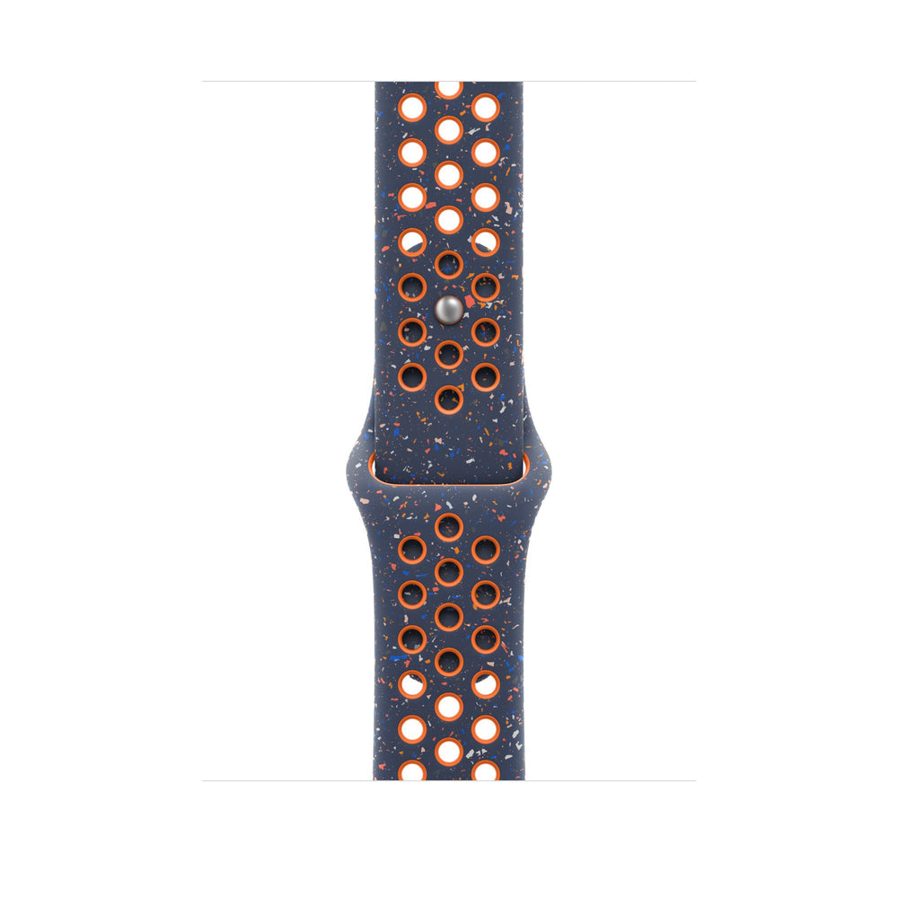 Band. Compatible device type: Smartwatch Apple. Material: Fluoroelastomer. Blue, Orange. 1 pc(s). Made with compression-molded perforations for breathability, the Nike Sport Band is durable and strong, yet surprisingly soft. It features colourful flakes that create a randomized pattern, making each strap completely unique. The smooth, dense material drapes elegantly across your wrist and feels comfortable next to your skin. An aluminum pin-and-tuck closure gives the pin a fresh matte finish.. This strap contains at least 30% recycled fluoroelastomer, with each flake containing at least 66% recycled fluoroelastomer.. Features. Band size. S/M. Buckle material. Aluminium. Material. Fluoroelastomer. Compatibility. Apple Watch Models 44mm, 45mm, 46mm, 49mm. Brand compatibility. Apple. Product colour. Blue, Orange. Compatible device type. Smartwatch. Product type. Band. Weight & dimensions. Wrist size range. 140 - 190 mm. Packaging content. Quantity per pack. 1 pc(s)