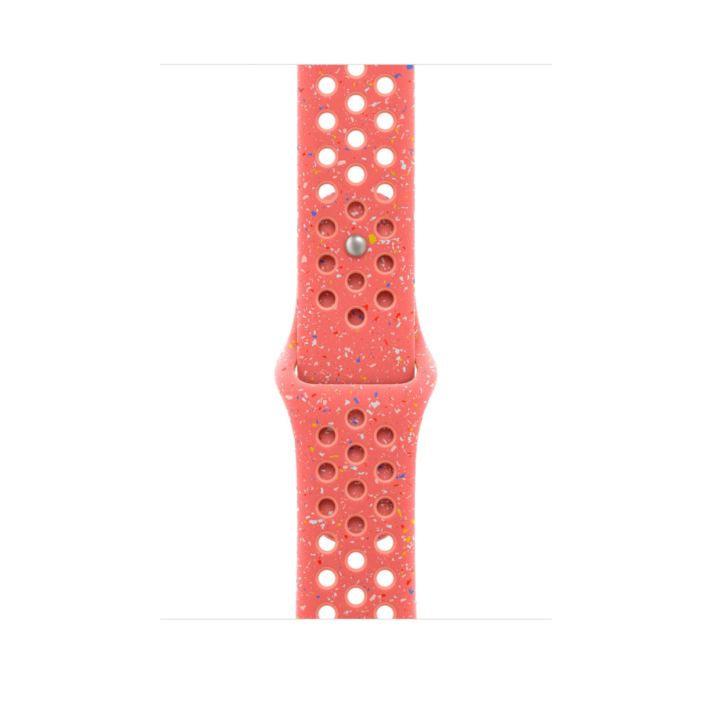 Band. Compatible device type: Smartwatch Apple. Material: Fluoroelastomer. Orange. 1 pc(s). Made with compression-molded perforations for breathability, the Nike Sport Band is durable and strong, yet surprisingly soft. It features colourful flakes that create a randomized pattern, making each strap completely unique. The smooth, dense material drapes elegantly across your wrist and feels comfortable next to your skin. An aluminum pin-and-tuck closure gives the pin a fresh matte finish.. This strap contains at least 30% recycled fluoroelastomer, with each flake containing at least 66% recycled fluoroelastomer.. Features. Band size. M/L. Buckle material. Aluminium. Material. Fluoroelastomer. Compatibility. Apple Watch Models 44mm, 45mm, 46mm, 49mm. Brand compatibility. Apple. Product colour. Orange. Compatible device type. Smartwatch. Product type. Band. Weight & dimensions. Wrist size range. 160 - 210 mm. Packaging content. Quantity per pack. 1 pc(s)