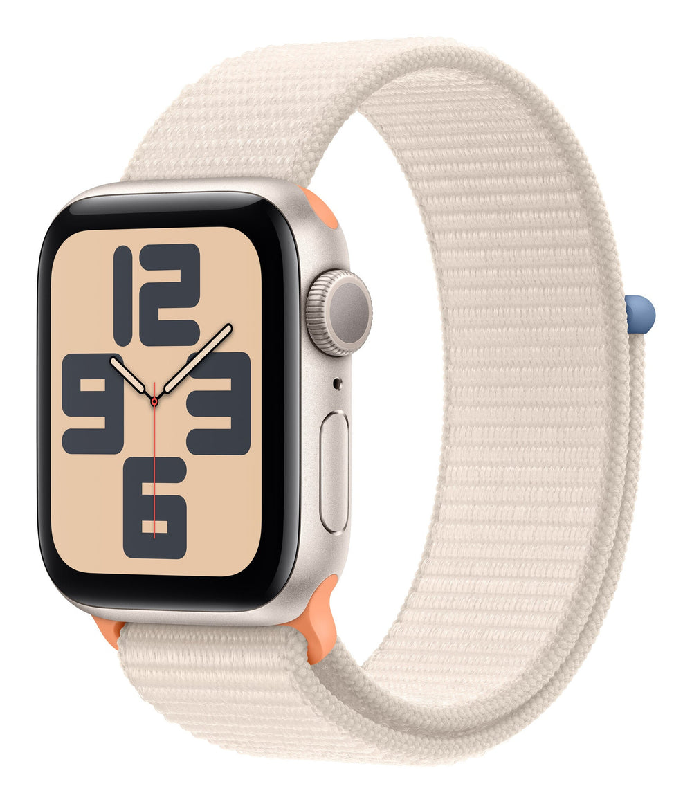 Smartwatch Digital Touchscreen OLED. 324 x 394 pixels 1000 cd/m². Water resistant, Waterproof Waterproof up to: 50 m. Built-in microphone Built-in speaker(s). Heart rate monitor Accelerometer Gyroscope Activity tracker Apple Siri. GPS (satellite) GLONASS Galileo Quasi-Zenith Satellite System (QZSS). Wi-Fi Bluetooth 5.0 Near Field Communication (NFC). Built-in battery 18 h. A great deal to love.. Easy ways to stay connected. Motivating fitness metrics. Innovative health and safety features. And now with carbon neutral case and band combinations. Apple Watch SE offers totally lovable features at a feel‑good price.. Display. Watch glass type. Ion-X glass. Rounded display corners. Yes. Display brightness. 1000 cd/m². Display technology. OLED. Touchscreen. Yes. Display resolution. 324 x 394 pixels. Display type. Digital. Performance. Fall detection. Yes. Crash detection. Yes. Wireless chipset. W3. 64-bit computing. Yes. Processor cores. 2. Processor model. S8. Processor manufacturer. Apple. Flash memory. 32 GB. Operating system installed. watchOS 9. Mobile operating systems supported. iOS. FM radio. No. Built-in camera. No. Built-in speaker(s). Yes. Built-in microphone. Yes. Design. Waterproof up to. 50 m. Magnetic charging connector. Yes. Protection features. Water resistant, Waterproof. Removable strap. Yes. Back material. Nylon, Sapphire glass. Shape. Rectangular. Band colour. Beige. Watch case material. Aluminium. Watch case colour. Beige. Watch case size. 40 mm. Market positioning. Smartwatch. Features. Altimeter. Yes. Haptic feedback. Yes. Virtual assistant. Apple Siri. E-mail. Yes. Electronic compass. Yes. Audible alarm(s). Yes. Ambient light sensor. Yes. SOS alert function. Yes. Short Message Service (SMS). Yes. Activity tracker. Yes. Gyroscope. Yes. Accelerometer. Yes. Heart rate sensor type. Optical. Heart rate monitor. Yes. Network. Quasi-Zenith Satellite System (QZSS). Yes. Galileo. Yes. GLONASS. Yes. GPS (satellite). Yes. Mobile network connection. No. Ports & interfaces. Headphone connectivity. Bluetooth. Near Field Communication (NFC). Yes. Bluetooth version. 5.0. Bluetooth. Yes. Wi-Fi standards. 802.11b, 802.11g, Wi-Fi 4 (802.11n). Wi-Fi. Yes. USB port. No. Power. Wireless charging. Yes. Battery life (max). 18 h. Battery type. Built-in battery. General. Product family. Watch. Product series. SE (2nd generation). Weight & dimensions. Weight. 26.4 g. Thickness. 1.07 cm. Depth. 40 mm. Width. 34 mm. Packaging content. Cables included. USB Type-C. Sustainability. Doesn't contain. Arsenic, BFR, Beryllium, Mercury, PVC