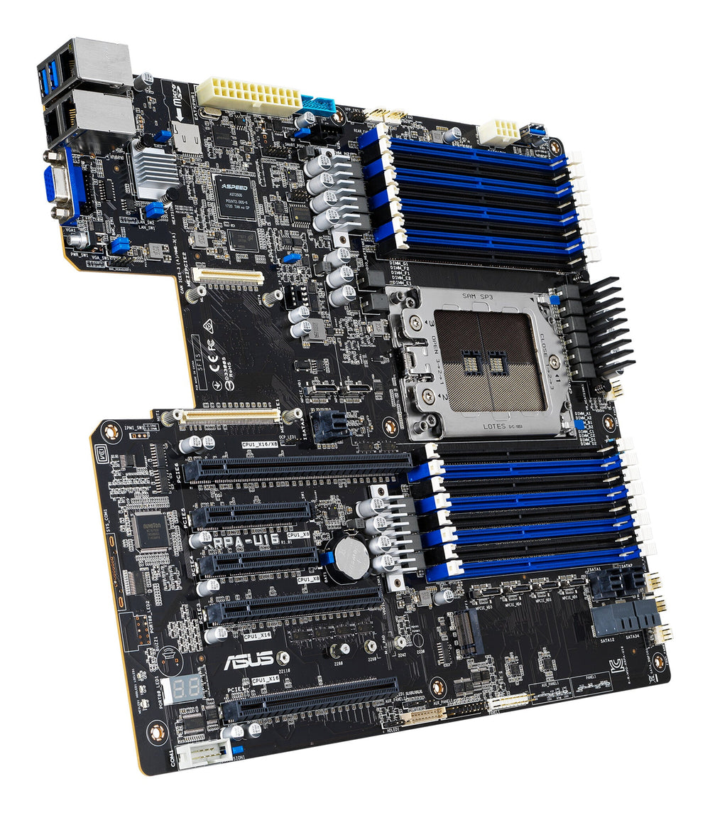 Powered by AMD EPYC™ 7002 Series Processors with enhanced I/O, memory and security. Features up to five PCI 4.0/3.0 lanes with 16 GT/s for next-gen connectivity. Supports up to 16 DIMMs for up to 2 TB of memory. Up to 12 NVMe drives via Oculink, plus ASUS riser cards to deliver low-latency performance. Dual onboard LAN for improved data throughput and efficiency, plus one optional OCP 2.0 mezzanine card supporting up to 100G or higher ultrafast speed for HPC. Complete IT infrastructure management with ASMB9-iKVM out-of-band remote management and ASUS Control Center for in-band management. Features ASUS-exclusive Thermal Radar 2.0 technology that automatically adjusts fan curves across various zones. Powered by AMD EPYC™ 7002 Series Processors. The AMD EPYC™ 7002 processor features the world’s first 7nm datacenter-design and a PCI Express® 4.0-capable x86 server processor with up to 2x the performance and 4x the floating point capability versus the previous 7001 generation. With support for up to 64 cores, 128 threads, 8-channels DDR4 3200, and 128 PCIe 4.0 lanes, this processor is also designed with encryption features in memory and virtualization for security assurance.. Rich I/O expansion with PCIe 4.0. PCIe 4.0 offers a 16 GT/s that doubles the bandwidth of PCIe 3.0 and delivers lower power consumption, better lane scalability and backwards compatibility. KRPA-U16 features up to 5 PCIe lanes, including two PCIe 4.0 lanes, and one PCIe 4.0 x24 that can be split to separate x16 and x8 link with an ASUS butterfly card for more storage and graphics power, or for network expansion.. Ultrafast connectivity for HPC applications. KRPA-U16 features two embedded Gigabit Ethernet ports and supports up to 100G or higher interconnect speeds with the addition of a PCIe 4.0 (Gen 4 x16 link) for its OCP 2.0 mezzanine card for HPC applications that require high-bandwidth, low-latency network support to connect multiple nodes and clusters. ASUS offers an authorized validation OCP mezzanine card for these models.. More storage, NVMe solutions. Designed for higher storage throughput performance and storage responsiveness for advanced computing, KRPA-U16 features 12 NVMe solutions with six onboard Oculink ports via a PCIe x4 link and six additional Oculink ports via an ASUS riser card for faster data transfers. Additionally, 16 SATA and SAS drives are available for budget-friendly applications.. Speed up with onboard M.2. With x4 PCI Express® 4.0 bandwidth, KRPA-U16 features up to 32Gbps M.2 for faster data-transfer speeds — ideal for an operating system or application drive.. Comprehensive IT infrastructure management. KRPA-U16 features an embedded iKVM module and ASUS Control Center software to provide comprehensive out-of-band and in-band management features for small and mid-size businesses.. The embedded ASMB9-iKVM module supports remote BIOS updates, fan control, standalone KVMs, video recording and BSOD capture, providing around-the-clock remote monitoring and diagnostics — even if the operating system is down or offline.. ASUS Control Center (ACC) is a centralized and integrated IT management platform for monitoring and controlling ASUS commercial products, including servers, workstations and digital signage. ACC enables remote BIOS updates, monitoring of multiple systems via mobile devices, and one-click software updates and dispatching, allowing easier server management for any IT infrastructure.. Exclusive Performance Boost technology. ASUS servers feature exclusive Performance Boost technology to achieve optimal server performance and agility by tuning servers to match workloads, allowing you to gain greater control of your server environment. This technology improves workload throughput by maximizing processor frequency and boost power. It’s ideal for time-sensitive applications such as financial services or data center operations. In the BIOS you can choose from pre-configured server profiles optimized for specific workloads, maximizing overall performance and reducing server-configuration time.. Thermal Radar 2.0. Exclusive Thermal Radar 2.0 for energy efficiency Featuring two innovative intelligent detection technologies and multi-fan-zone design, ASUS Thermal Radar 2.0 places sensors on the CPU, GPU, DIMM, HDD and in other areas to collect localized heating information so it can automatically adjust fan airflow. The multi-fan-zone design enables multiple fan curve options for each zone to improve efficiency and to effectively enhance system reliability and thermal efficiency.. Processor. Compatible processor series. AMD EPYC 7002, AMD EPYC 7003. Processor socket. Socket SP3. Processor manufacturer. AMD. Memory. Maximum internal memory. 2.05 TB. Supported memory clock speeds. 2666,2933,3200 MHz. Memory channels. Single-channel. Number of memory slots. 16. Supported memory types. DDR4-SDRAM. Storage controllers. Number of storage drives supported. 17. Supported storage drive interfaces. M.2, SATA III. Supported storage drive types. HDD & SSD. Graphics. On-board graphics card model. Aspeed AST2500. On-board graphics card memory. 64 MB. On-board graphics card. Yes. Parallel processing technology support. Not supported. Internal I/O. Serial port headers. 1. TPM connector. Yes. Number of chassis fan connectors. 8. Number of SATA III connectors. 16. USB 3.2 Gen 1 (3.1 Gen 1) connectors. 1. Rear panel I/O ports. VGA (D-Sub) ports quantity. 1. Ethernet LAN (RJ-45) ports. 3. USB 3.2 Gen 1 (3.1 Gen 1) Type-A ports quantity. 2. Network. Wi-Fi. No. LAN controller. Intel® I350-AM2. Ethernet interface type. Gigabit Ethernet. Ethernet LAN. Yes. Features. Motherboard form factor. EEB. Component for. Server. Expansion slots. Number of M.2 (M) slots. 1. PCI Express x16 (Gen 3.x) slots. 3. PCI Express x8 slots. 2. Weight & dimensions. Depth. 330 mm. Width. 305 mm. manual pdf. leaflet
