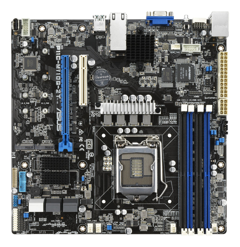 Powered by the Intel Xeon E platform. 95W CPU and up to 128GB memory support (4 DIMMs). Rack-optimized design maximizes cooling for excellent thermal efficiency. Flexible expandability with 6 native SATA HDDs and two PCIe Gen3 slots. Dual Intel® X550AT Gigabit Ethernet with teaming support. Dual M.2 for up to 32Gbps performance and data redundancy. TPM 2.0 Ready secures store keys, digital certificates, passwords and data. Complete server management with ASUS Control Center. Optional ASMB9-iKVM module available for 24/7 remote monitoring and diagnostics. Intel Xeon E micro-ATX server motherboard with rack-optimized design and high speed 10G networking. Micro-ATX compact server board with multiple expandability options. P11C-M/10G-2T is a server motherboard based on the Intel® Xeon® E platform and Intel® C242 chipset offering dual server-class Intel® Ethernet and flexible expandability with dual M.2, six SATA 6G, two PCIe. The 9.6” x 9.6” micro ATX form factor can be easily integrated in short-depth chassis to greatly increase rack compute density.. The layout is rack-optimized placement where the CPU and memory are placed in a parallel arrangement directly behind the fan inlet to promote maximum cooling for excellent thermal efficiency.. Dual M.2 for up to 32Gbps performance speed NVMe support. P11C-M/10G-2T support max 5NVMe drives(3x 2.5-inch SSDs and 2x M.2) through PCIe bifurcation from CPU. In performance-maximizing RAID 0 configurations with dual M.2 SSDs, write speeds are up to 40% faster than a single M.2 SSD drive setup and read operations are an astonishing 84% faster. Or, for total reassurance, pair your M.2 devices into a RAID 1 configuration for instant data redundancy.. NVMe high-speed storage interface. P11C-M/10G-2T adopts the first-to-market NVMe technology to reduce latency, lower power consumption and provides faster CPU to data storage performance to gain larger throughputs. By offering flexible NVMe upgrade package of switching storage interface including PCIe to U.2 add-on card or M.2 to U.2 adapter, P11C-M/10G-2T features shared common backplane to improve drive choices.. High bandwidth networking. With built-in dual Intel 10G Base-T networking, P11C-M/10G-2T increases data throughput and improves datacenter efficiency — and that means more environmentally-friendly operation. You're able to build high-density, high-bandwidth and low-latency access-layer networks for your datacenter on a board.. TPM-M 2.0 ready. P11C-M/10G-2T supports TPM-M 2.0 with a 14-1 TPM header to securely store keys, digital certificates, passwords and data. It helps to enhance network security, protect digital identities, and ensure platform integrity.. Comprehensive IT infrastructure management. P11C-M/10G-2T features an optional embedded iKVM module and is bundled with ASUS Control Center to provide comprehensive out-of-band and in-band management features for small and mid-size businesses.. The optional ASMB9-iKVM module supports remote BIOS updates, fan control, standalone KVMs, video recording, and BSOD capture, providing around-the-clock remote monitoring and diagnostics — even if the operating system is down or offline — through a user-friendly, web-based graphical interface that works with all major browsers.. ASUS Control Center (ACC) is a centralized and integrated IT management platform for monitoring and controlling ASUS commercial products, including servers, workstations and digital signage. ACC enables remote BIOS updates, monitoring of multiple systems via mobile devices, and one-click software updates and dispatching, allowing easier server management for any IT infrastructure.. Enhanced serviceability. With its power button located on the front I/O panel, P11C-M/10G-2T is designed to provide easier maintenance and deployment for diverse applications.. Quick initialization guidance. P11C-M/10G-2T provides instant system information during initialization as well as any unusual diagnostic results for more efficient IT operation and easy troubleshooting.. ASUS ProCool connector. ASUS ProCool is designed without hollow area, this enables lower impedance, facilitates faster heat dissipation, resulting in cooler operating temperature. Reduces power loss and increases cost savings.. Processor. Processor number of cores supported. 8. Intel Xeon series. E-2200, E-2100. Compatible processor series. Intel® Xeon®, Intel Xeon E. Processor socket. LGA 1151 (Socket H4). Processor manufacturer. Intel. Memory. Supported memory module capacities. 4GB, 8GB, 16GB, 32GB. Maximum internal memory. 64 GB. Supported memory clock speeds. 2400,2666 MHz. ECC сompatibility. ECC & Non-ECC. Memory channels. Dual-channel. Memory slots type. DIMM. Number of memory slots. 4. Supported memory types. DDR4-SDRAM. Storage controllers. RAID levels. 0, 1, 5, 10. RAID support. Yes. Number of storage drives supported. 7. Number of HDDs supported. 6. Supported storage drive interfaces. M.2, SATA III. Supported storage drive types. HDD & SSD. Graphics. Parallel processing technology support. Not supported. Internal I/O. RGB LED pin header. Yes. TPM connector. Yes. Peripheral (Molex) power connectors (4-pin). 3. Chassis intrusion connector. Yes. Number of chassis fan connectors. 1. ATX Power connector (24-pin). Yes. Number of SATA III connectors. 6. USB 2.0 connectors. 1. Rear panel I/O ports. VGA (D-Sub) ports quantity. 1. Ethernet LAN (RJ-45) ports. 3. USB 3.2 Gen 2 (3.1 Gen 2) Type-A ports quantity. 2. USB 3.2 Gen 1 (3.1 Gen 1) Type-A ports quantity. 2. Network. Wi-Fi. No. LAN controller. Intel® I210-AT. Ethernet interface type. Gigabit Ethernet. Ethernet LAN. Yes. Features. Motherboard chipset. Intel C242. Motherboard form factor. Mini-ITX. Component for. PC. Expansion slots. Number of M.2 (M) slots. 2. PCI Express x16 (Gen 3.x) slots. 7. Processor special features. Trusted Platform Module (TPM). Yes. Operational conditions. Storage relative humidity (H-H). 20 - 90%. Operating relative humidity (