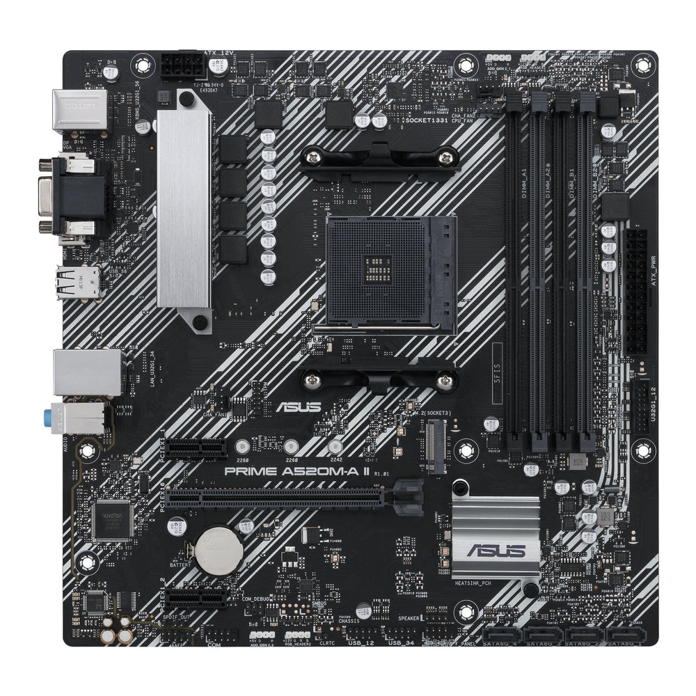 AMD AM4 socket: Ready for Ryzen™ 5000 Series/ 4000 G-Series/ 3000 Series Desktop Processors. Comprehensive cooling: VRM heatsink, PCH heatsink, and Fan Xpert 2+. Ultrafast connectivity: M.2 support,1 Gb Ethernet, USB 3.2 Gen 1 Type-A. Aura Sync RGB: Onboard RGB headers and addressable Gen 2 headers for RGB LED strips, easily synced with Aura Sync-capable hardware. ASUS Prime series is expertly engineered to unleash the full potential of AMD Ryzen platform. Boasting a robust power design, comprehensive cooling solutions and intelligent tuning options, Prime A520 series motherboards provide daily users and DIY PC builders a range of performance tuning options via intuitive software and firmware features.. Tune It Your Way. Comprehensive controls form the foundation of the ASUS Prime series. The Prime A520 motherboard packs flexible tools to tune every aspect of your system, enabling you to tweak performance settings to perfectly match the way you work – maximizing your productivity.. UEFI BIOS. The renowned ASUS UEFI BIOS provides everything you need to configure, tweak and tune your system. It offers intelligently simplified options for PC DIY beginners, as well as comprehensive features for seasoned veterans.. Advanced Tuning for Serious Tweakers. An intuitive Advanced mode offered via the UEFI lets you take complete control. A built-in search feature makes it easy to find options, and various Advanced functions let you intelligently make nuanced adjustments so you can dial in performance just the way you want.. Search Function. Quickly and easily find the option or setting you need.. ASUS User Profile. Port configuration settings between different BIOS versions or share them with friends.. Quick and Simple Setup. EZ mode displays vital settings and stats and also offers guided wizards, drag-and-drop functionality, and one-click application of important settings — all to help you get your rig up and running in no time.. Intuitive Graphical Fan Control. Fine-tune individual fan settings simply by dragging a curve with the mouse.. EZ XMP. Improve DRAM performance with one click.. Aura On/Off Mode (Stealth). Easily enable or disable Aura RGB lighting or every onboard LED, for a subdued aesthetic touch.. Cool to the Core. PRIME A520M-A II is engineered with multiple onboard heatsinks and an array of hybrid fan headers to ensure your rig stays cool and stable under intense workloads.. VRM Heatsink and Thermal Pad. A VRM heatsink with underneath thermal pad improves heat transfer from the MOSFETs for better cooling performance.. Cooler by Design. Prime A520M-A II is engineered with an array of hybrid fan headers and features comprehensive cooling controls that are configurable via Fan Xpert 2+ software or via the UEFI BIOS, ensuring your rig stays cool and stable under intense workloads.. Build on a Solid Foundation. Prime A520 motherboard provides all the fundamentals to boost daily productivity, so your system will be ready for action with stable power, intuitive cooling and flexible transfer options.. PCIe 3.0 M.2 (up to 32 Gbps). Achieve speed with onboard M.2. M.2 slot supports up to 2280 and data-transfer speeds of up to 32 Gbps via x4 PCI Express 3.0 bandwidth. It‘s the perfect choice for an operating system or application drive, providing fast access to data.. USB 3.2 Gen 1 Type-A. Numerous USB ports support high-end rigs loaded with peripherals, including four rear-panel USB Type-A connectors with fast USB 3.2 Gen 1 connectivity for compatible cases.. Little Things Make a Big Difference. Prime A520 series adds the nuanced details that improve every experience, from exclusive codecs that provide pristine audio quality to intuitive interface that let you customize your system to create a uniquely personal look.. Outstanding Audio. Combined onboard features deliver elevated audio. Intelligent design and premium hardware create audio quality unlike anything you've ever experienced.. Audio Shielding. Separates analog/digital signal domains, significantly reducing multi-lateral interference.. Separate Layer for Left and Right Tracks. Ensures minimal crosstalk between audio paths.. Premium Japanese Capacitors. Premium parts provide an immersive sound signature, with exceptional fidelity.. Aura Sync. Outshine the Competition. A well-tuned enthusiast system deserves a matching aesthetic. ASUS Aura offers full RGB lighting control with a variety of functional presets for RGB LED strips connected to the onboard RGB headers. And it can all be synced with an ever-growing portfolio of Aura-capable hardware.. Addressable Gen 2 RGB Header. The addressable Gen 2 RGB header is now capable of detecting the number of LEDs on second-gen addressable RGB devices, allowing the software to automatically tailor lighting effects to specific devices. The new header also offers backward-compatibility with existing Aura RGB gear.. Armoury Crate. Armoury Crate is a new software utility designed to give you centralized control of supported products. From a single intuitive interface, Armoury Crate allows you to easily customize RGB lighting and effects for every compatible device in your arsenal. The software also provides control of settings for ASUS products, including keyboard and mouse preferences. Armoury Crate even features dedicated product registration and highlight to help you stay in touch with the ASUS community.. Processor. Supported processor sockets. Socket AM4. Compatible processor series. AMD Ryzen 3000 Series, AMD Ryzen 5000 Series. Processor socket. Socket AM4. Processor manufacturer. AMD. Memory. Unbuffered memory. Yes. Maximum internal memory. 128 GB. Supported memory clock speeds. 2133,2400,2666,2800,3000,3200,3333,3466,3600,3733,3866,4000,4133,4266,4400,4466,4600,4800 MHz. ECC сompatibility. ECC. Memory channels. Dual-channel. Memory slots type. DIMM. Number of memory slots. 4. Supported memory types. DDR4-SDRAM. Storage controllers. RAID levels. 0, 1, 10. Number of storage drives supp