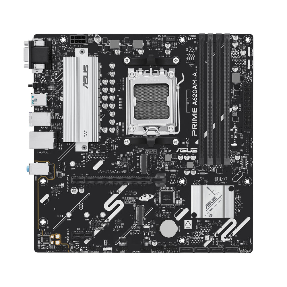 AMD Socket AM5 AMD Ryzen 7000 Series, AMD Ryzen 8000 Series, AMD Ryzen 9000 Series. PC micro ATX AMD A620A 7.1 channels. DDR5-SDRAM 4 DIMM Maximum internal memory: 256 GB. HDD & SSD M.2, SATA III RAID support Number of storage drives supported: 6. BIOS type: UEFI AMI 256 Mbit. Gigabit Ethernet. A620AM-A-CSM. ASUS Prime series motherboards are expertly engineered to unleash the full potential of AMD Ryzen™ 9000 series processors. The PRIME A620AM-A-CSM motherboard provides users and PC DIY builders with a range of performance optimizations via intuitive software and firmware features. It’s designed to be Advanced AI PC-ready, offering the power and connectivity needed for demanding AI applications.. Processor. Supported processor sockets. Socket AM5. Compatible processor series. AMD Ryzen 7000 Series, AMD Ryzen 8000 Series, AMD Ryzen 9000 Series. Processor socket. Socket AM5. Processor manufacturer. AMD. Memory. Unbuffered memory. Yes. Maximum internal memory. 256 GB. ECC сompatibility. ECC & Non-ECC. Memory channels. Dual-channel. Memory slots type. DIMM. Number of memory slots. 4. Supported memory types. DDR5-SDRAM. Storage controllers. RAID levels. 0, 1, 5, 10. RAID support. Yes. Number of storage drives supported. 6. Number of HDDs supported. 4. Supported storage drive interfaces. M.2, SATA III. Supported storage drive types. HDD & SSD. Graphics. Parallel processing technology support. Not supported. Internal I/O. Number of RGB LED pin headers. 3. RGB LED pin header. Yes. Number of COM connectors. 1. TPM connector. Yes. 12V power connector. Yes. EPS power connector (8-pin). Yes. Number of chassis fan connectors. 2. Number of CPU fan connectors. 1. CPU fan connector. Yes. ATX Power connector (24-pin). Yes. Front panel connector. Yes. Front panel audio connector. Yes. S/PDIF out connector. Yes. Number of SATA III connectors. 4. USB 3.2 Gen 1 (3.1 Gen 1) connectors. 2. USB 2.0 connectors. 2. Rear panel I/O ports. DisplayPorts quantity. 1. HDMI ports quantity. 1. VGA (D-Sub) ports quantity. 1. PS/2 ports quantity. 1. Ethernet LAN (RJ-45) ports. 1. USB 3.2 Gen 2 (3.1 Gen 2) Type-A ports quantity. 2. USB 2.0 ports quantity. 4. Network. Wi-Fi. No. Ethernet interface type. Gigabit Ethernet. Ethernet LAN. Yes. Features. Windows operating systems supported. Windows 10 x64, Windows 11. Audio output channels. 7.1 channels. Motherboard chipset. AMD A620A. Motherboard chipset family. AMD. Motherboard form factor. micro ATX. Component for. PC. Expansion slots. 2nd M.2 highest PCI Express generation. 4.0. 2nd M.2 largest key size. 2280. 1st M.2 highest PCI Express generation. 4.0. 1st M.2 largest key size. 2280. Number of M.2 (M) slots. 2. PCI Express x16 (Gen 4.x) slots. 1. PCI Express x1 (Gen 3.x) slots. 1. BIOS. BIOS memory size. 256 Mbit. BIOS type. UEFI AMI. Packaging data. Package weight. 1.1 kg. Package height. 67.5 mm. Package depth. 275 mm. Package width. 275 mm. Weight & dimensions. Depth. 244 mm. Width. 244 mm. Packaging content. Screws included. Yes. Cables included. SATA