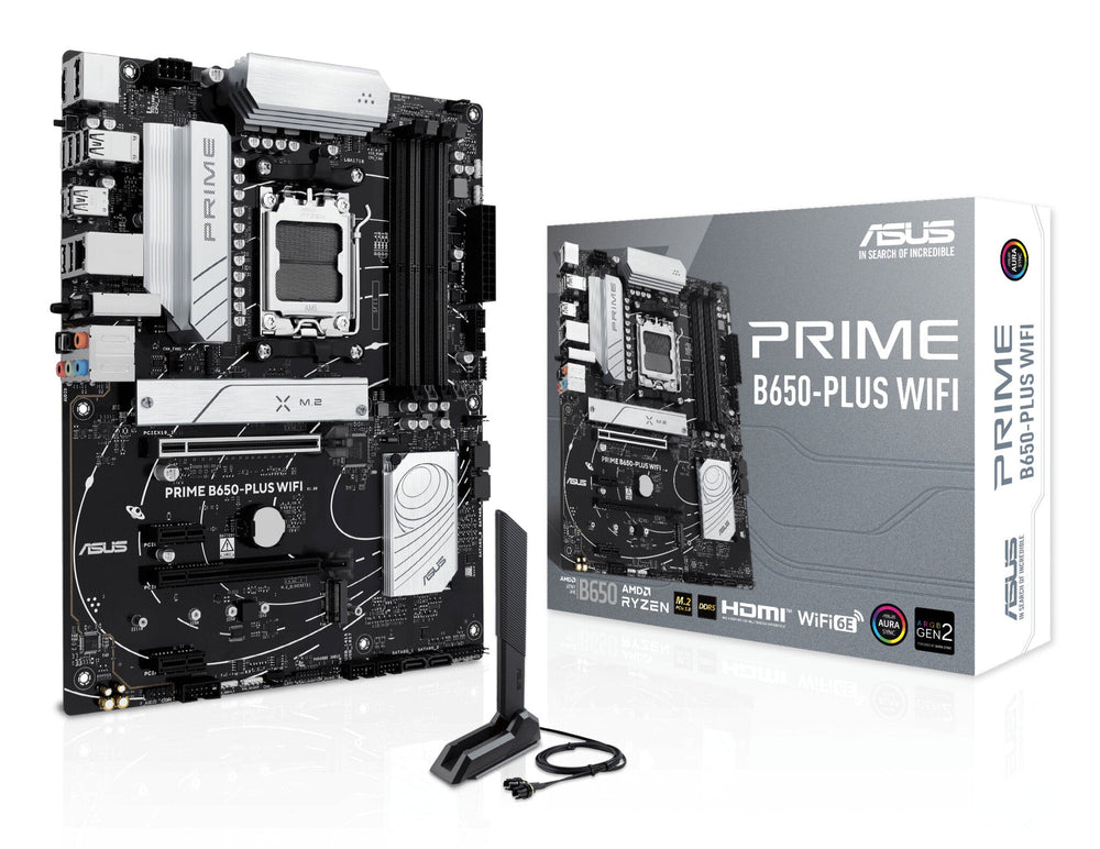 AMD AM5 Socket: Ready for AMD Ryzen™ 9000 & 8000 & 7000 Series Desktop Processors. Ultrafast Connectivity: WIFI 6E, M.2 PCIe 5.0, Realtek 2.5Gb Ethernet, USB 10Gbps Type-C®, front USB 5Gbps Type-C®, Thunderbolt™ 4 header support. ASUS OptiMem II: Careful routing of traces and vias, plus ground layer optimizations to preserve signal integrity for improved memory overclocking. Comprehensive Cooling: VRM heatsink, M.2 heatsink, PCH heatsink, hybrid fan headers and Fan Xpert 2+. Aura Sync RGB Lighting: Onboard Addressable Gen 2 headers and Aura RGB header for RGB LED strips, easily synced with Aura Sync-capable hardware. B650-PLUS WIFI. ASUS Prime series motherboards are expertly engineered to unleash the full potential of AMD Ryzen 9000 & 8000 & 7000 Series processors. Boasting a robust power design, comprehensive cooling solutions and intelligent tuning options, PRIME B650-PLUS WIFI provides users and PC DIY builders with a range of performance optimizations via intuitive software and firmware features. This platform delivers the power and connectivity that advanced AI PC applications demand.. Processor. Supported processor sockets. Socket AM5. Compatible processor series. AMD Ryzen 7000 Series, AMD Ryzen 8000 Series, AMD Ryzen 9000 Series. Processor socket. Socket AM5. Processor manufacturer. AMD. Memory. Unbuffered memory. Yes. Maximum internal memory. 192 GB. Supported memory clock speed (max). 7600 MHz. Supported memory clock speeds. 7400,4800,7600,7800,5000,5200,5400,5600,5800,6000,6200,6400,6600,6800,7000,7200 MHz. ECC сompatibility. ECC & Non-ECC. Memory channels. Dual-channel. Memory slots type. DIMM. Number of memory slots. 4. Supported memory types. DDR5-SDRAM. Storage controllers. RAID levels. 0, 1, 10. RAID support. Yes. Number of storage drives supported. 6. Number of HDDs supported. 4. Supported storage drive interfaces. M.2, SATA III. Supported storage drive types. HDD & SSD. Graphics. Parallel processing technology support. Not supported. Internal I/O. Number of RGB LED pin headers. 1. RGB LED pin header. Yes. Number of COM connectors. 1. TPM connector. Yes. Thunderbolt headers. 1. 12V power connector. Yes. EPS power connector (8-pin). Yes. Number of chassis fan connectors. 3. Number of CPU fan connectors. 2. CPU fan connector. Yes. ATX Power connector (24-pin). Yes. Front panel connector. Yes. Front panel audio connector. Yes. Number of SATA III connectors. 4. USB 3.2 Gen 1 (3.1 Gen 1) connectors. 2. USB 2.0 connectors. 2. Rear panel I/O ports. WiFi-AP antenna jack. 1. S/PDIF out port. Yes. DisplayPorts quantity. 1. HDMI ports quantity. 1. Ethernet LAN (RJ-45) ports. 1. USB 3.2 Gen 2 (3.1 Gen 2) Type-C ports quantity. 1. USB 3.2 Gen 2 (3.1 Gen 2) Type-A ports quantity. 3. USB 3.2 Gen 1 (3.1 Gen 1) Type-A ports quantity. 2. USB 2.0 ports quantity. 2. Network. Bluetooth version. 5.3. Bluetooth. Yes. Wi-Fi standards. Wi-Fi 6E (802.11ax). Top Wi-Fi standard. Wi-Fi 6E (802.11ax). Wi-Fi. Yes. Ethernet interface type. 2.5 Gigabit Ethernet. Ethernet LAN. Yes. Features. Windows operating systems supported. Windows 10 x64, Windows 11. Audio output channels. 7.1 channels. Motherboard chipset. AMD B650. Motherboard chipset family. AMD. Motherboard form factor. ATX. Component for. PC. Expansion slots. 2nd M.2 highest PCI Express generation. 4.0. 2nd M.2 largest key size. 22110. 1st M.2 highest PCI Express generation. 5.0. 1st M.2 largest key size. 22110. Number of M.2 (M) slots. 2. PCI Express x16 (Gen 4.x) slots. 2. PCI Express x1 (Gen 4.x) slots. 2. BIOS. BIOS memory size. 256 Mbit. BIOS type. UEFI AMI. Packaging data. Package weight. 1.35 kg. Package height. 68 mm. Package depth. 373 mm. Package width. 338 mm. Weight & dimensions. Depth. 244 mm. Width. 305 mm. Packaging content. Antenna included. Yes. Screws included. Yes. Cables included. SATA. manual pdf