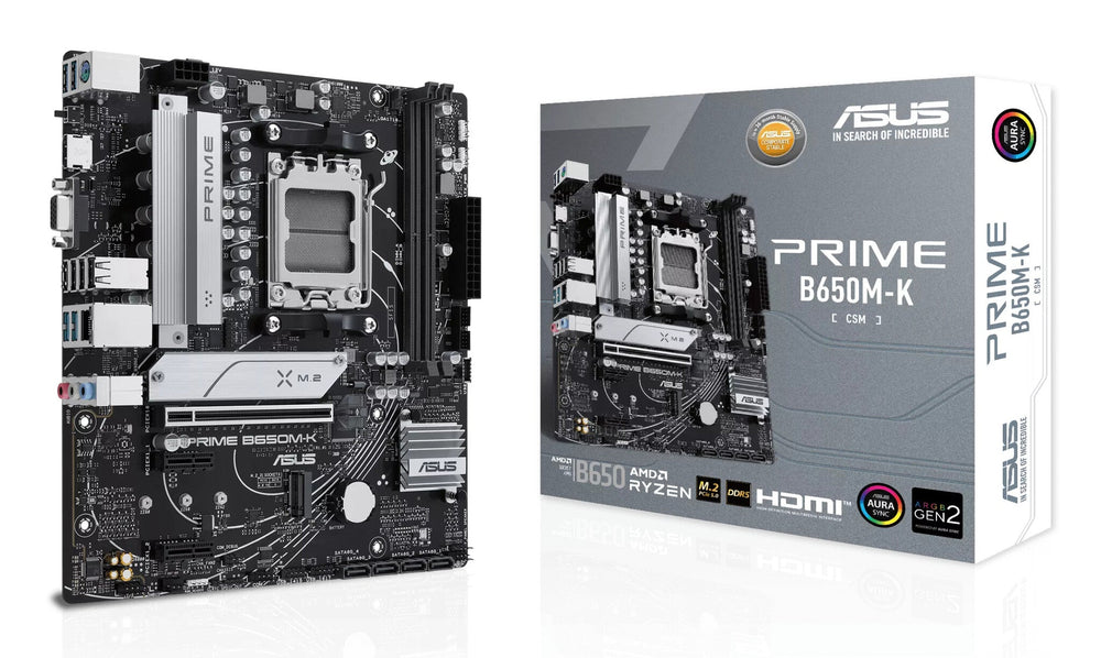 AMD AM5 Socket: Ready for AMD Ryzen™ 7000 Series Desktop Processors. Ultrafast Connectivity: M.2 PCIe 5.0, Realtek 2.5Gb Ethernet, USB 3.2 Gen 2 ports, front USB 3.2 Gen 1 Type-C®. ASUS OptiMem II: Careful routing of traces and vias, plus ground layer optimizations to preserve signal integrity for improved memory overclocking. Comprehensive Cooling: VRM heatsink, M.2 heatsink, PCH heatsink, hybrid fan headers and Fan Xpert 2+. Aura Sync RGB Lighting: Onboard Addressable Gen 2 headers and Aura RGB header for RGB LED strips, easily synced with Aura Sync-capable hardware. B650M-K. ASUS Prime series motherboards are expertly engineered to unleash the full potential of AMD Ryzen 7000-series processors. Boasting a robust power design, comprehensive cooling solutions and intelligent tuning options, PRIME B650M-K provides users and PC DIY builders with a range of performance optimizations via intuitive software and firmware features.. FLEXIBILITY. Comprehensive controls form the foundation of the ASUS PRIME series. The PRIME B650 motherboard packs flexible tools to tune every aspect of your system, enabling performance tweaks to perfectly match the way you work to maximize productivity.. CPU Performance Boost. AMD Precision Boost Overdrive(PBO) pushes the CPU current and voltage budget to opportunistically increase performance. By aggressively tuning the PBO parameters, AMD‘s algorithm can leverage the motherboard’s robust power solution to ramp up performance even higher.. COOLING. PRIME B650 series is engineered with multiple onboard heatsinks and an array of hybrid fan headers to ensure your rig stays cool and stable under intense workloads.. VRM Heatsink and Thermal Pad. VRM heatsink and thermal pads improve heat transfer from the MOSFETs and chokes for better cooling performance.. Cooler by Design. Prime B650 series features comprehensive cooling controls that are configurable via Fan Xpert 2+ software or via the UEFI BIOS.. Multiple Temperature Sources. Each header can dynamically reference four thermal sensors. Fan Xpert 2+ allows you to map the temperature of supported ASUS graphics cards to optimize cooling for GPU- and CPU-intensive tasks.. PERFORMANCE. The PRIME B650 series is built to handle the high core counts and bandwidth demands of AMD processors. ASUS B650 motherboard provides all the fundamentals to boost daily productivity, so your system will be ready for action with stable power, intuitive cooling and flexible data transfer options.. DDR5 Performance Enhancement. Comprehensive memory tuning options are the cornerstone of PRIME motherboards. With the PRIME B650M-A AX, you can extract all of the potential out of your DDR5 modules, whether they're from an extreme-speed kit or an entry-level set that would otherwise be locked.. For entry-level modules without EXPO™ memory support, we’ve got you covered. Click here to learn more about AEMP. arrow.. For those who want to fly past stock DDR5 speeds, the PRIME B650M-A AX is primed and ready for enthusiast-grade kits courtesy of vast AMD Extended Profiles for Overclocking (EXPO™) support. Seasoned veterans can further tweak performance via the extensive array of settings in the UEFI.. Outstanding Audio. Combined onboard features deliver elevated audio. Intelligent design and premium hardware create audio quality unlike anything you’ve ever experienced.. THIS CHANGES EVERYTHING.. FROM THIS NEW PLATFORM, YOU CAN SEE THE FUTURE. Build your next rig with an AMD Ryzen™ 7000 Series processor and PRIME B650M-A AX to experience advanced performance. With up to 16 “Zen 4” cores and 32 threads, boost clocks of up to 5.7GHz, and 80MB cache, the AMD Ryzen™ 7000 Series keeps you ahead of the game.1. You’ll also gain access to new features for gamers with AMD Socket AM5, from the speed of DDR5 memory to the increased bandwidth of PCIe® 5.0. AMD Ryzen™ 7000 Series processors and AMD socket AM5 motherboards are unlocked for overclocking to personalize your experience. Gain even more performance when you overclock your DDR5 memory with AMD EXPO™ technology.2. Processor. Supported processor sockets. Socket AM5. Compatible processor series. AMD Ryzen 7000 Series. Processor socket. Socket AM5. Processor manufacturer. AMD. Memory. Unbuffered memory. Yes. Maximum internal memory. 96 GB. Supported memory clock speed (max). 6400 MHz. Supported memory clock speeds. 4800,5000,5200,5400,5600,5800,6000,6200,6400 MHz. ECC сompatibility. ECC & Non-ECC. Memory channels. Dual-channel. Memory slots type. DIMM. Number of memory slots. 2. Supported memory types. DDR5-SDRAM. Storage controllers. RAID levels. 0, 1, 10. RAID support. Yes. Number of storage drives supported. 6. Number of HDDs supported. 4. Supported storage drive interfaces. M.2, SATA III. Supported storage drive types. HDD & SSD. Graphics. Parallel processing technology support. Not supported. Internal I/O. RGB LED pin header. Yes. Number of COM connectors. 1. TPM connector. Yes. 12V power connector. Yes. EPS power connector (8-pin). Yes. Number of chassis fan connectors. 2. CPU fan connector. Yes. ATX Power connector (24-pin). Yes. Front panel audio connector. Yes. Audio connector. Yes. S/PDIF out connector. Yes. Number of SATA III connectors. 4. USB 3.2 Gen 1 (3.1 Gen 1) connectors. 2. USB 2.0 connectors. 2. Rear panel I/O ports. Microphone in. Yes. Headphone outputs. 1. Line-in. Yes. HDMI ports quantity. 1. VGA (D-Sub) ports quantity. 1. PS/2 ports quantity. 1. Ethernet LAN (RJ-45) ports. 1. USB 3.2 Gen 2 (3.1 Gen 2) Type-A ports quantity. 2. USB 3.2 Gen 1 (3.1 Gen 1) Type-A ports quantity. 2. USB 2.0 ports quantity. 4. Network. Wi-Fi. No. Ethernet interface type. 2.5 Gigabit Ethernet. Ethernet LAN. Yes. Features. Windows operating systems supported. Windows 10 x64, Windows 11. Audio output channels. 7.1 channels. Motherboard chipset. AMD B650. Motherboard chipset family. AMD. Motherboard form factor. micro ATX. Component for. PC. Expansion slots. Number of M.2 (M) slot