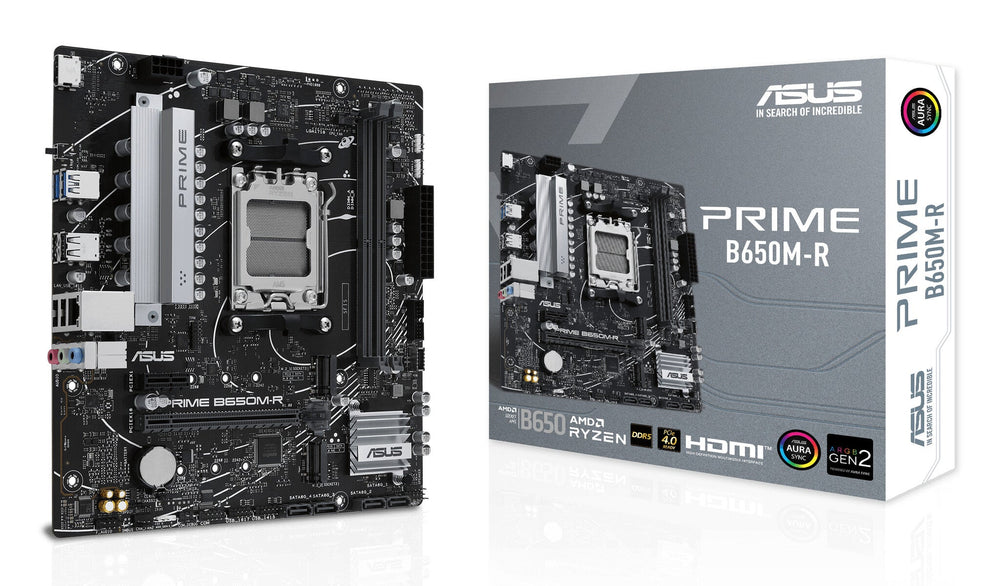 AM5 Socket for AMD Ryzen Desktop Processors. Ultrafast Connectivity: PCIe 4.0, two M.2 slots, Realtek 2.5Gb Ethernet, USB 5Gbps ports, front USB 5Gbps Type-C. Comprehensive Cooling: VRM heatsink, PCH heatsink, hybrid fan headers and Fan Xpert 2+. Aura Sync RGB Lighting: Onboard Addressable Gen 2 headers for RGB LED strips, easily synced with Aura Sync-capable hardware. Two-way AI Noise Cancelation: Reduces background noise from the microphone and audio output for crystal-clear communication in games or video conferences. ASUS Prime series motherboards are expertly engineered to unleash the full potential of AMD Ryzen 7000-series processors. Boasting a robust power design, comprehensive cooling solutions and intelligent tuning options, PRIME B650M-R provides users and PC DIY builders with a range of performance optimizations via intuitive software and firmware features.. FLEXIBILITY. Comprehensive controls form the foundation of the ASUS PRIME series. The PRIME B650 motherboard packs flexible tools to tune every aspect of your system, enabling performance tweaks to perfectly match the way you work to maximize productivity.. Intelligent Control. CPU Performance Boost. AMD Precision Boost Overdrive(PBO) pushes the CPU current and voltage budget to opportunistically increase performance. By aggressively tuning the PBO parameters, AMD‘s algorithm can leverage the motherboard’s robust power solution to ramp up performance even higher.. All-Around Energy Efficiency. The Power Saving function contains several settings can easily optimize power consumption and maximize energy savings. You can enable a CPU power limit, darken Aura lighting, and set the fan profile to a power saving mode. You can also toggle the Power Saver plan that is built into Microsoft Windows.. Flexible Cooling Controls. ASUS Fan Xpert 2+ software provides comprehensive control over fans. An Auto-Tuning mode intelligently configures all parameters with a single click. There’s also an Extreme Quiet mode that reduces chassis fan speeds to below the default minimum to keep your system whisper-quiet when performing light tasks. Fans can also be controlled via the UEFI BIOS.. Precise Digital Power Control. The Digi+ voltage-regulator module (VRM) delivers real-time control over voltage droop, automatically switching frequency and power-efficiency settings. It also allows you to fine-tune your CPU for ultimate stability and performance.. UEFI BIOS. The renowned ASUS UEFI BIOS provides everything you need to configure, tweak and tune your system. It offers intelligently simplified options for PC DIY beginners, as well as comprehensive features for seasoned veterans.. Advanced Tuning for Serious Tweakers. An intuitive Advanced mode offered via the UEFI lets you take complete control. A built-in search feature makes it easy to find options, and various advanced functions let you intelligently make nuanced adjustments so you can dial in performance just the way you want.. Quick and Simple Setup. EZ mode displays vital settings and stats and also offers guided wizards, drag-and-drop functionality, and one-click application of important settings — all to help you get your rig up and running in no time.. Intuitive Graphical Fan Control. Fine-tune individual fan settings simply by dragging a curve with the mouse.. Aura On/Off Mode (Stealth). Easily enable or disable Aura RGB lighting or every onboard LED, for a subdued aesthetic touch.. COOLING. Prime B650 series are engineered with multiple onboard heatsinks and an array of hybrid fan headers to ensure your rig stays cool and stable under intense workloads.. VRM Heatsink and Thermal Pad. VRM heatsink and thermal pads improve heat transfer from the MOSFETs and chokes for better cooling performance.. Cooler by Design. Prime B650 series feature comprehensive cooling controls that are configurable via Fan Xpert 2+ software or via the UEFI BIOS.. Stack Cool 3+. 2oz copper PCB design can draw heat away from critical components to keep the optimal operating temperatures.. PERFORMANCE. The PRIME B650 series is built to handle the high core counts and bandwidth demands of AMD processors. ASUS B650 motherboard provides all the fundamentals to boost daily productivity, so your system will be ready for action with stable power, intuitive cooling and flexible data transfer options.. Memory. DDR5 Performance Enhancement. Comprehensive memory tuning options are the cornerstone of PRIME motherboards. With the PRIME B650M-R, you can extract all of the potential out of your DDR5 modules, whether they're from an extreme-speed kit or an entry-level set that would otherwise be locked.. For entry-level modules without EXPO™ memory support, we’ve got you covered. Click here to learn more about AEMP. arrow.. For those who want to fly past stock DDR5 speeds, the PRIME B650M-R is primed and ready for enthusiast-grade kits courtesy of vast AMD Extended Profiles for Overclocking (EXPO™) support. Seasoned veterans can further tweak performance via the extensive array of settings in the UEFI.. Storage. PCIe 4.0 M.2 Support. PRIME B650M-R offers two M.2 slots that supports data-transfer speeds of up to 64 Gbps via PCIe 4.0, enabling quicker boot-up and app load times with OS or application drives.. *Actual transmission speeds will be lower than the theoretical maximum speed.. Connectivity. PCIe 4.0 Slot. Prime B650 motherboards offer PCIe 4.0 Slot connectivity for the latest GPUs. The wide bandwidth and superfast transmission speeds allow you to create feature-rich builds that can handle high loads effortlessly.. Front USB Type-C®. A full complement of USB ports support high-end rigs loaded with peripherals, including a front-panel USB 5Gbps Type-C® connector that provides data transfer speeds of up to 5Gbps.. Realtek 2.5 Gb Ethernet. Realtek 2.5 Gb Ethernet reduces CPU overhead and offers exceptionally high TCP and UDP throughput for faster, smoother data transfers.. LANGuard. ASUS LANGuard is a hardwa