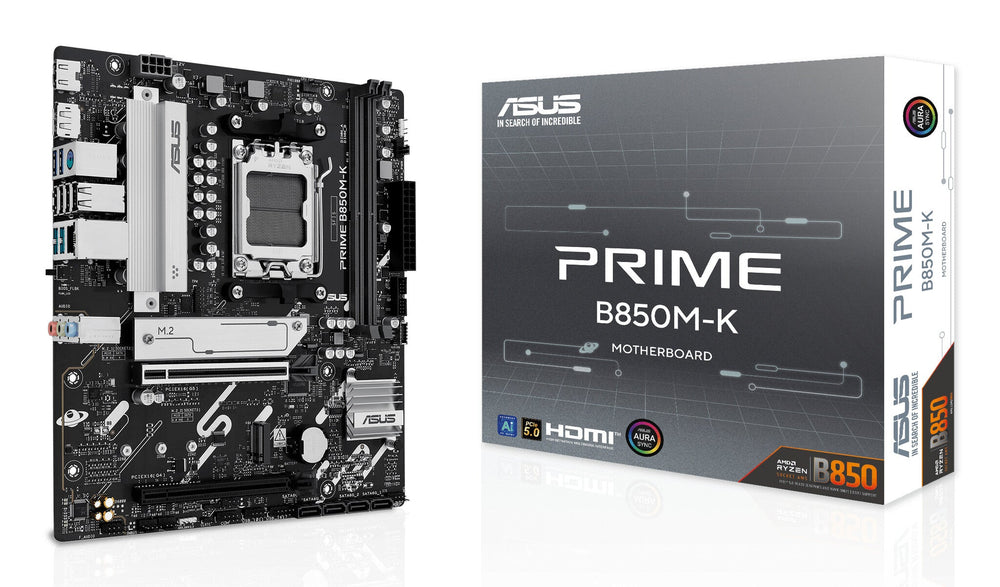 AMD Socket AM5 AMD Ryzen 7000 Series, AMD Ryzen 8000 Series, AMD Ryzen 9000 Series. PC micro ATX AMD B850 7.1 channels. DDR5-SDRAM 2 DIMM Maximum internal memory: 128 GB. HDD & SSD M.2, SATA III RAID support Number of storage drives supported: 6. BIOS type: UEFI AMI 256 Mbit. 2.5 Gigabit Ethernet. B850M-K. ASUS Prime series motherboards are expertly engineered to unleash the full potential of AMD Ryzen™ 9000 series processors. The PRIME B850M-K motherboard provides users and PC DIY builders with a range of performance optimizations via intuitive software and firmware features. It’s designed to be Advanced AI PC-ready, offering the power and connectivity needed for demanding AI applications.. Processor. Supported processor sockets. Socket AM5. Compatible processor series. AMD Ryzen 7000 Series, AMD Ryzen 8000 Series, AMD Ryzen 9000 Series. Processor socket. Socket AM5. Processor manufacturer. AMD. Memory. Unbuffered memory. Yes. Maximum internal memory. 128 GB. ECC сompatibility. ECC & Non-ECC. Memory channels. Dual-channel. Memory slots type. DIMM. Number of memory slots. 2. Supported memory types. DDR5-SDRAM. Storage controllers. RAID levels. 0, 1, 5, 10. RAID support. Yes. Number of storage drives supported. 6. Number of HDDs supported. 4. Supported storage drive interfaces. M.2, SATA III. Supported storage drive types. HDD & SSD. Graphics. Parallel processing technology support. Not supported. Internal I/O. RGB LED pin header. Yes. Number of COM connectors. 1. TPM connector. Yes. 12V power connector. Yes. EPS power connector (8-pin). Yes. Number of chassis fan connectors. 3. Number of CPU fan connectors. 1. CPU fan connector. Yes. ATX Power connector (24-pin). Yes. Front panel connector. Yes. Front panel audio connector. Yes. S/PDIF out connector. Yes. Number of SATA III connectors. 4. USB 3.2 Gen 1 (3.1 Gen 1) connectors. 2. USB 2.0 connectors. 2. Rear panel I/O ports. Microphone in. Yes. Line-in. Yes. DisplayPorts quantity. 1. HDMI ports quantity. 1. PS/2 ports quantity. 1. Ethernet LAN (RJ-45) ports. 1. USB 3.2 Gen 2 (3.1 Gen 2) Type-A ports quantity. 2. USB 3.2 Gen 1 (3.1 Gen 1) Type-A ports quantity. 2. USB 2.0 ports quantity. 4. Network. Wi-Fi. No. Ethernet interface type. 2.5 Gigabit Ethernet. Ethernet LAN. Yes. Features. Windows operating systems supported. Windows 10 x64, Windows 11. Cooling type. Passive. Product colour. Black. Audio output channels. 7.1 channels. Motherboard chipset. AMD B850. Motherboard chipset family. AMD. Motherboard form factor. micro ATX. Component for. PC. Expansion slots. 2nd M.2 highest PCI Express generation. 4.0. 2nd M.2 largest key size. 2280. 1st M.2 highest PCI Express generation. 5.0. 1st M.2 largest key size. 2280. Number of M.2 (M) slots. 2. PCI Express x16 (Gen 5.x) slots. 1. PCI Express x16 (Gen 4.x) slots. 1. BIOS. BIOS memory size. 256 Mbit. BIOS type. UEFI AMI. Packaging data. Package weight. 1.07 kg. Package height. 297 mm. Package depth. 288 mm. Package width. 564 mm. Weight & dimensions. Depth. 221 mm. Width. 244 mm. Packaging content. Screws included. Yes. Cables included. SATA. manual pdf