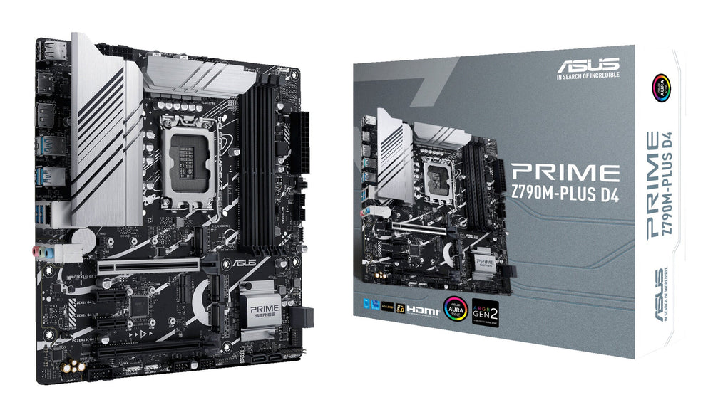 Intel® LGA 1700 socket: Ready for 12th and 13th Gen Intel® processors. Enhanced power solution: 10+1 DrMOS, 6-layer PCB, ProCool connectors, alloy chokes and durable capacitors for stable power delivery. Next-gen connectivity: PCIe® 5.0, Intel® 1 Gb Ethernet, USB 3.2 Gen2x2 Type-C®, front panel USB 3.2 Gen 1 Type-C®, Thunderbolt™ (USB4®) header support. ASUS OptiMem II: Careful routing of traces and vias, plus ground layer optimizations to preserve signal integrity for improved memory overclocking. Comprehensive cooling: Large VRM heatsinks, PCH heatsink, hybrid fan headers and Fan Xpert 4 with AI Cooling II. PRIME Z790M-PLUS D4. ASUS Prime series motherboards are expertly engineered to unleash the full potential of 13th Gen Intel® Core™ Processors. Boasting a robust power design, comprehensive cooling solutions and intelligent tuning options, PRIME Z790M-PLUS D4 provides users and PC DIY builders with a range of performance optimizations via intuitive software and firmware features.. FLEXIBILITY. Comprehensive controls form the foundation of the ASUS PRIME series. The PRIME Z790M-PLUS D4 motherboard packs flexible tools to tune every aspect of your system, enabling performance tweaks to perfectly match the way you work to maximize productivity.. Intelligent Control. ASUS Intelligent Control makes your PC smart. Along with taking care of complex tuning and dynamically optimizing essential aspects of your system, it offers intelligently simplified options for newcomers to PC DIY, as well as more comprehensive features for seasoned veterans.. All-Around Energy Efficiency. The Power Saving function contains several settings can easily optimize power consumption and maximize energy savings. You can enable a CPU power limit, darken Aura lighting, and set the fan profile to a power saving mode. You can also toggle the Power Saver plan that is built into Microsoft Windows.. COOLING. PRIME Z790M-PLUS D4 motherboard is engineered with multiple onboard heatsinks and an array of hybrid fan headers to ensure your rig stays cool and stable under intense workloads.. VRM Heatsinks and Thermal Pads. The extensive surface area of the massive heatsinks cover the VRMs and chokes to improve heat dissipation. Together with specially engineered thermal pads, they improve heat transfer from the MOSFETs and chokes for better cooling performance.. Cooler by Design. PRIME Z790M-PLUS D4 features comprehensive cooling controls that are configurable via Fan Xpert 4 software or via the UEFI BIOS.. Multiple Temperature Sources. Each header can dynamically reference three thermal sensors. Fan Xpert 4 allows you to map the temperature of supported ASUS graphics cards to optimize cooling for GPU- and CPU-intensive tasks.. PERFORMANCE. The PRIME Z790M-PLUS D4 motherboard is built to handle the high core counts and bandwidth demands of 13th Gen Intel® Core™ Processors. ASUS Z790 motherboard provides all the fundamentals to boost daily productivity, so your system will be ready for action with stable power, intuitive cooling and flexible data transfer options.. Robust Power Design. Stable power is essential to extract every last bit of performance out of Intel processors. The PRIME Z790M-PLUS D4 is geared to cater to the demands of these high-core-count CPUs.. ProCool Connectors. Proprietary connectors augment the motherboard's link to the PSU with 4 + 8 pin connectors that pass 12 volts of power directly to the processors. Each jack features solid pins that can handle more current than hollow-pin connectors.. Outstanding Audio. Combined onboard features deliver elevated audio. Intelligent design and premium hardware create audio quality unlike anything you’ve ever experienced.. Audio Shielding. Audio shielding ensures precision analog/digital separation and greatly reduced multi-lateral interference.. Dedicated Audio PCB Layers. Separate layers for left and right tracks ensures both channels deliver consistent, equal quality.. Premium Audio Capacitors. Provides warm, natural, and immersive sound with exceptional clarity and fidelity.. Processor. Supported processor sockets. LGA 1700. Compatible processor series. Intel® Celeron®, Intel® Core™ i3, Intel® Core™ i5, Intel® Core™ i7, Intel® Core™ i9, Intel® Pentium® Gold. Processor socket. LGA 1700. Processor manufacturer. Intel. Memory. Unbuffered memory. Yes. Maximum internal memory. 128 GB. Supported memory clock speed (max). 5333 MHz. Supported memory clock speeds. 2133,2400,2666,2800,2933,3000,3200,3333,3400,3466,3600,3733,3866,4000,4133,4266,4400,4500,4600,4700,4800,5000,5066,5133,5333 MHz. ECC сompatibility. Non-ECC. Memory channels. Dual-channel. Memory slots type. DIMM. Number of memory slots. 4. Supported memory types. DDR4-SDRAM. Storage controllers. RAID levels. 0, 1, 5, 10. RAID support. Yes. Supported storage drive interfaces. M.2, SATA III. Supported storage drive types. HDD & SSD. Graphics. Parallel processing technology support. Not supported. Internal I/O. RGB LED pin header. Yes. Number of COM connectors. 1. TPM connector. Yes. Thunderbolt headers. 1. 12V power connector. Yes. EPS power connector (8-pin). Yes. Peripheral (Molex) power connectors (4-pin). 1. Chassis intrusion connector. Yes. Number of chassis fan connectors. 3. CPU fan connector. Yes. ATX Power connector (24-pin). Yes. Front panel audio connector. Yes. S/PDIF out connector. Yes. Number of SATA III connectors. 4. USB 3.2 Gen 1 (3.1 Gen 1) connectors. 2. USB 2.0 connectors. 2. Rear panel I/O ports. Microphone in. Yes. Headphone outputs. 1. Line-in. Yes. DisplayPorts quantity. 1. HDMI ports quantity. 1. Ethernet LAN (RJ-45) ports. 1. USB 3.2 Gen 2x2 Type-C ports quantity. 1. USB 3.2 Gen 2 (3.1 Gen 2) Type-A ports quantity. 1. USB 3.2 Gen 1 (3.1 Gen 1) Type-A ports quantity. 4. USB 2.0 ports quantity. 2. Network. Wi-Fi. Yes. Ethernet interface type. Gigabit Ethernet. Ethernet LAN. Yes. Features. Windows operating systems supported. Windows 10 x64, Windows 11. Powe