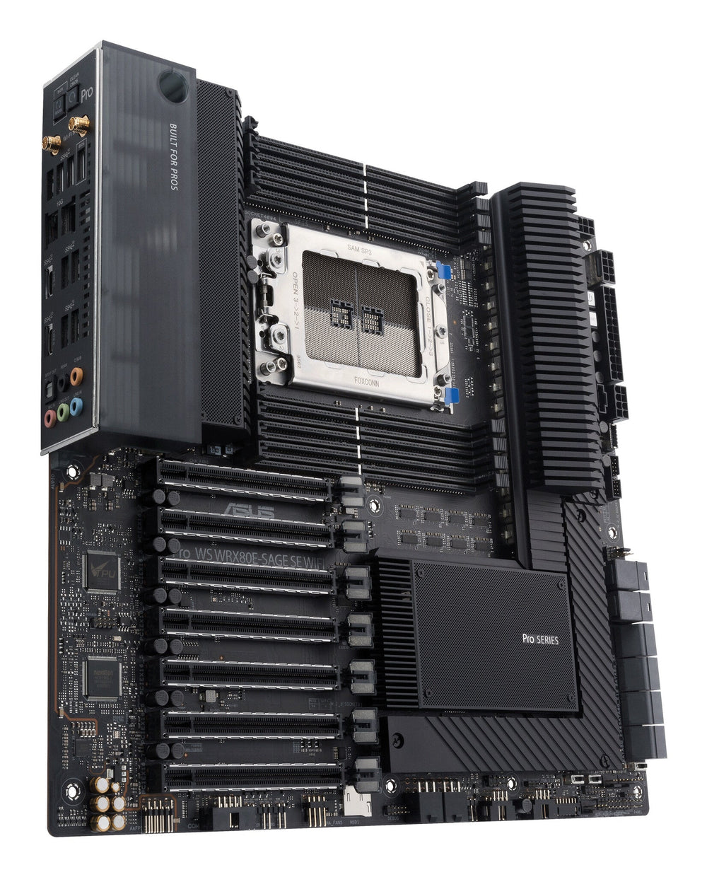 AMD sWRX8 socket: Ready for AMD Ryzen™ Threadripper™ PRO Series Processors. Ultrafast connectivity: USB 3.2 Gen 2x2 Type-C port, 10 x USB 3.2 Gen 2 ports, 3 x M.2 PCIe 4.0, HYPER M.2 x16 Gen 4 card and Intel® X550-AT2 dual 10Gb Ethernet. ASMB9-iKVM remote management: BMC chip to provide intelligence for its IPMI architecture for out-of-band management to enhance hardware-level control for improved IT efficiency. Powerful performance: 16 power stages, multi-GPU support and R-DIMM memory support. Trusted stability: Tested for 24/7 dependability, validated for solid compatibility and equipped with SafeSlot for ultimate security. Ultimate power for professional productivity. ASUS Pro WS WRX80E-SAGE SE WIFI is engineered to unleash the incredible power of the latest AMD® Ryzen® Threadripper™ Pro series processors and is a reliable foundation for professional creative workloads that benefit from multi-core CPUs, such as video editing and 3D rendering. Additionally, seven PCIe 4.0 slots with SafeSlot fortification deliver exceptional performance with the latest high-power graphics cards.. FUNCTION-FIRST. AESTHETICS. Low-profile professionalism. With metallic black aluminum extrusions, stainless steel black mesh with highlighted details, and a transparent smoky gray I/O cover, Pro WS WRX80E-SAGE SE WIFI presents a professional, low-profile look for content creators.. Multi-GPU support. Pro WS WRX80E-SAGE SE WIFI features seven PCIe® 4.0 x16 slots for high-powered graphics cards, enabling enhanced performance for professional design, modeling and simulation, and rendering applications.. ULTRAFAST CONNECTIVITY TO POWER CREATIVITY. Intel® dual 10G Ethernet. Featuring dual onboard 10G LAN ports powered by the cutting-edge Intel® X550-AT2 Ethernet controller, Pro WS WRX80E-SAGE SE WIFI makes short work of multi-terabyte transfers from your creativities and provides server-grade connectivity with low-latency.. USB 3.2 Gen 2 x 2 Type C. The latest USB standard doubles transfer bandwidth by opening another USB 3.2 Gen 2 lane to achieve its maximum throughput of up to 20 Gbps. In addition to blazingly fast data-transfer speeds, USB 3.2 offers easy connectivity and ultimate flexibility via USB-C ports.. Front-panel connector. The front panel USB 3.2 Gen 2 connector is ready for next-gen PC cases and devices.. 3 M.2 PCIe 4.0. Pro WS WRX80E-SAGE SE WIFI includes three M.2 and two U.2 slots wired to PCIe 4.0 x4 bandwidth. Creators working with massive video files can RAID together multiple NVMe devices for massive I/O bandwidth and seamless playback in their editing bays. These three slots rest under dedicated heatsinks to prevent SSD throttling under heavy loads.. More storage. With NVMe RAID support for Ryzen™ Threadripper™ PRO processors, unused CPU PCIe® 4.0 lanes can be assigned to storage, allowing you to create a bootable RAID array with multiple M.2 SSDs to provide incredible throughput — up to 8x faster than individual PCIe® 3.0 x4 SSDs. RAID can also be configured with PCIe® 3.0 SSDs.. * With included ASUS Hyper M.2 x16 Gen 4 card. RAID is limited to a maximum of 10 NVMe SSDs on the AMD WRX80 platform.. ECC memory support. AMD Ryzen™ Threadripper™ PRO processors offer unrivaled memory bandwidth and supports 8 memory channels, up to 2048 GB. It supports ECC memory to automatically detect and correct data corruption, reducing the chance of system crashes to ensure your creativity consistency and stability.. Intel® WiFi 6. The Intel® WiFi 6 AX200 module is compatible with the 802.11ax standard and pushes theoretical peak bandwidth up to an incredible 2.4 Gbps. Perhaps more importantly for power users, it's optimized for more efficient operation on crowded networks with a lot of competing traffic. Pair your motherboard with ASUS WiFi 6 routers to fully experience the networking potential of WiFi 6.. *Actual speed varies and depends on networking conditions.. ULTRAFAST CONNECTIVITY DELIVERY CREATIVITY. SERVER-GRADE REMOTE MANAGEMENT. ASMB9-iKVM for remote management. An integrated BMC (Baseboard Management Controller) is a key feature for workstations. It uses an Intel X550 dual 10 Gigabit Ethernet controller, with one port dedicated to the BMC to provide the intelligence for its IPMI architecture. The BMC manages the interface between system-management software and platform hardware. Administrators can remotely communicate with the BMC to take some corrective actions — such as resetting or power cycling a system.. 16 Power stages. Pro WS WRX80E-SAGE SE WIFI’s VRM is comprised of 16 power stages, delivering the power and efficiency that the latest AMD processors demand.. 6-pin Power connectors. Two additional PCIe 6-pin power connectors can add power output stability when creators use many graphic cards onboard.. THOROUGH THERMAL DESIGN. SOC and DRAM heatsink. Since mass and airflow are critically important, our VRM heatsink is manufactured with skived, high aspect ratio thin fins. An SOC heatsink uses a semi-passive fan to draw heat away from the dual 10G LAN.. Actively cooled heatsink. The heatsink fin density is optimized to maximize surface area while maintaining a low-resistance exhaust path. The custom low-noise fan features a high-durability bearing with a 60,000-hour L10* lifespan.. * L10 bearing life is a standard metric that specifies the number of hours that 90% of the bearing are expected to continue successfully operating, as a minimum.. M.2 heatsinks. Three M.2 slots are covered by heatsinks to combat. temperature-induced throttling that can affect performance during heavy, sustained storage loads.. DIY FRIENDLY. Side-mounted connectors. Unique side-mounted connectors on the front-panel of the chassis keep cables away from the graphics cards and provide cleaner routing, easier management and a streamlined installation process.. Pre-mounted I/O shield. The patented I/O shield is finished in sleek matte black and comes pre-mounted for easy installation on the m