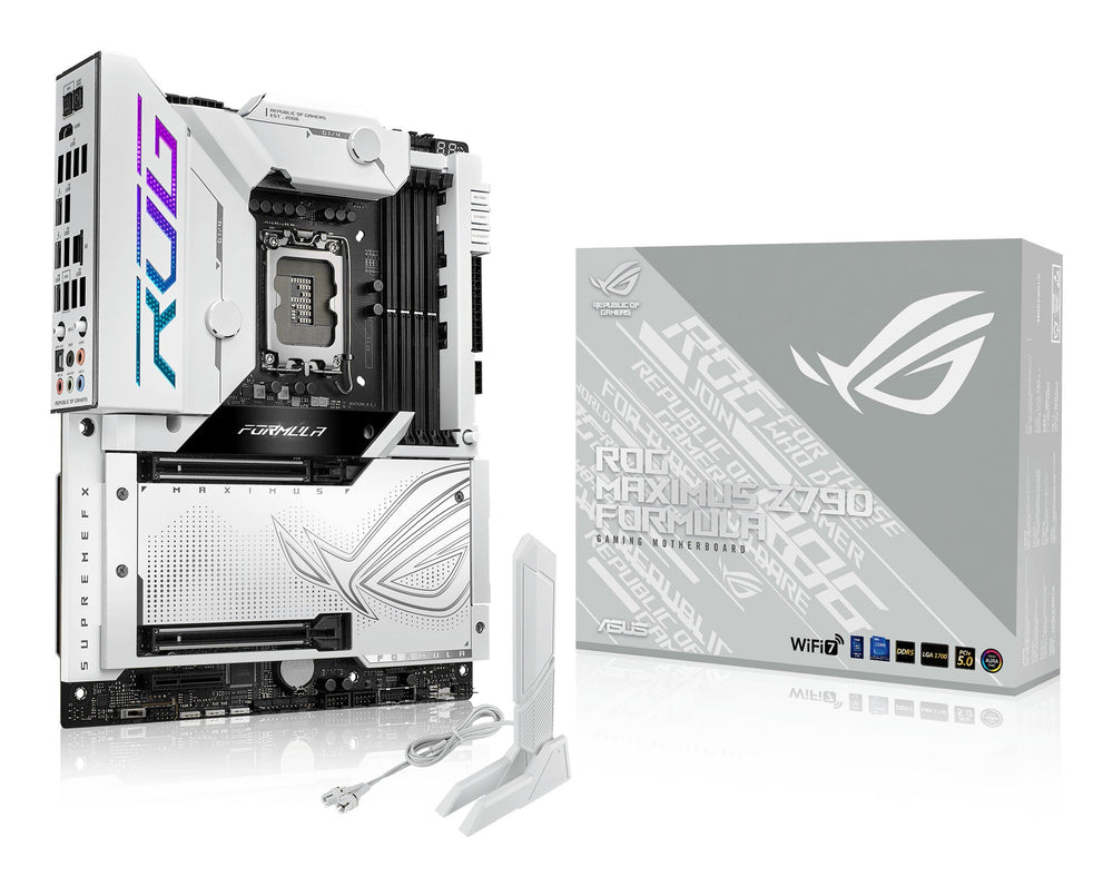 Intel LGA 1700 Intel® Celeron®, Intel® Core™ i3, Intel® Core™ i5, Intel® Core™ i7, Intel® Core™ i9, Intel® Pentium® Gold. PC ATX Intel Z790 Realtek ALC4082 7.1 channels. DDR5-SDRAM 4 DIMM Maximum internal memory: 192 GB. HDD & SSD M.2, SATA III RAID support Number of storage drives supported: 9. BIOS type: UEFI AMI 256 Mbit Clear CMOS button. 5 Gigabit Ethernet Wi-Fi Wi-Fi 7 (802.11be) Bluetooth 5.4. The ROG Maximus Z790 Formula is the ultimate motherboard to feature our head-turning Moonlight White aesthetic. Beneath this bold expression lies a powerhouse arsenal of features, including the exclusive HybridChill VRM cooling system ready to elevate 14th-gen Intel® processors, advanced DDR5 settings, a multitude of PCIe 5.0 slots for both graphics cards and storage, blistering Intel® Wi-Fi 7 networking and a full slate of customizable ARGB lightning to make your premium build truly stand out from the crowd.. ROG OVERCLOCKING TECHNOLOGIES. Maximize your CPU’s performance potential with intuitive tools that offer advanced control and monitoring.. AI OVERCLOCKING. Tuning is now faster and smarter than ever before. ASUS AI Overclocking profiles the CPU and cooling to predict the optimal configuration and push the system to its limits. Predicted values can be engaged automatically or used as a launching ground for further experimentation.. DIFFERENTIAL SENSING. Conventional motherboards use single-ended sensing tapped from a location that isn’t ideal, leading to a large disparity between the actual voltage fed to the CPU and the value reported to software. The ROG Maximus Z790 Formula features a differential-sensing circuit and delicate IC that simplify overclocking and tuning by allowing you to track voltages more accurately.. TEAMED POWER ARCHITECTURE. Today’s CPU architectures place incredible demands on motherboard power design by transitioning from deep power-saving modes, going from lower-power mode to full load in an instant. The latest ROG VRM architecture rises to the challenge by utilizing teamed power stages to rapidly swing current, while maintaining exemplary thermal performance.. ASUS became the first manufacturer to implement phase-doublers with the A8N32-SLI Deluxe motherboard, back in 2005. The board’s VRM was lauded for elegantly overcoming the power handling capabilities of components that were available at the time while also reducing voltage ripple. Those benefits led to phase-doublers becoming universally accepted in the industry, and they are still used for similar purposes today.. Modern CPUs pack more cores than their predecessors, and the latest instruction sets allow them to crunch computationally dense workloads at an incredible pace. In addition, they consume less power at idle and can transition between load states much more quickly. These improvements necessitate a re-evaluation of power-design priorities because phase-doublers add a propagation delay that hampers transient response.. Fortunately, the latest integrated power components can handle higher currents than the devices of yesteryear, making it possible to implement a simple circuit topology that isn’t hamstrung by the processing lag of phase-doublers. That’s why the ROG Maximus Z790 Formula utilizes teamed power stages to deliver higher burst current per phase, while maintaining the thermal performance of phase-doubled designs.. Each VRM component serves a specific purpose. PWM controllers and phase-doublers control the circuit, and the power stages do the heavy lifting from an electrical and thermal standpoint. The power stages feature low RDSON to reduce switching and conduction losses, helping to improve overall thermal headroom.. MEMORY. Comprehensive memory tuning options are the cornerstone of ROG motherboards. With the ROG Maximus Z790 Formula, you can extract all of the potential out of your DDR5 modules, regardless of if they’re from an extreme-speed kit or an entry-level set that would otherwise be locked.. ROG has a long legacy of flexing the fastest memory performance, and DDR5 is no outlier. Thanks to improved signal routing, now enthusiast-grade kits have been driven far beyond the 8 GT/s mark on the Maximus Z790 Formula, and who knows how far future DIMMs can go? Seasoned veterans can test their mettle by tinkering with the extensive array of tuning options in the UEFI.. DIMM Flex provides enthusiasts a powerful new way to overclock their memory by employing specialized hardware circuitry to address the stability issues in DDR5 memory caused by temperature sensitivity. When temperatures permit, it can maximize memory performance and efficiency, and when temperatures increase, it can adjust memory performance downward to maintain stability.. ASUS Enhanced Memory Profile II (AEMP II) is an exclusive firmware feature that allows users to achieve supreme memory performance and compatibility with optimized clock speeds, even when they're using PMIC-restricted memory modules that do not provide an XMP or EXPO profile. Developed through a flexible training method, AEMP II simplifies the process of fine-tuning memory settings beyond the baseline configuration, all while ensuring system stability. This applies whether you are maximizing the potential of an entry-level module or preparing a high-speed kit for ultimate performance.. Now, AEMP II offers even more flexibility. With the latest firmware update, AEMP II allows users to optimize the performance of a four-DIMM DDR5 RAM configuration, even with a mixture of different brands and dies. Increasing the memory capacity of your build by adding additional DIMMs has never been easier — with AEMP II, you can get optimized memory performance even when all four memory modules are not an exact match, provided that all four DIMMs have the same capacity.. HYBRIDCHILL. The ASUS HybridChill water block leverages a fusion of passive and liquid cooling to achieve highly efficient VRM operation. Its copper water channels resis
