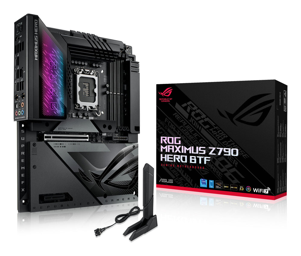 Intel LGA 1700 Intel® Celeron®, Intel® Core™ i3, Intel® Core™ i5, Intel® Core™ i7, Intel® Core™ i9, Intel® Pentium® Gold. PC ATX Intel Z790 Realtek ALC4082 7.1 channels. DDR5-SDRAM 4 DIMM Maximum internal memory: 192 GB. HDD & SSD M.2, SATA III RAID support Number of storage drives supported: 9. BIOS type: UEFI AMI 256 Mbit Clear CMOS button. 2.5 Gigabit Ethernet Wi-Fi Wi-Fi 7 (802.11be) Bluetooth 5.4. ROG Maximus Z790 Hero BTF is the first ROG motherboard with a hidden-connector design and graphics card high-power slot that delivers up to 600 watts of power for BTF graphics cards through the motherboard, providing an unprecedented level of cable management to PC DIY enthusiasts. It also boasts robust cooling, WiFi 7 and ample PCIe® 5.0 slots for unmatched performance, plus full compatibility with 14th Gen Intel® Core™ processors.. ADVANCED BTF DESIGN. With the combination of a BTF graphics card, motherboard and chassis, you can enjoy a full hidden-connector experience. This Advanced BTF approach is achieved through the new graphics card high-power slot available on BTF motherboards, which can deliver up to 600 watts to BTF graphics cards. With a full set of BTF components, builders can eliminate visible cables for an extra-clean aesthetic.. DIY-FRIENDLY FEATURES. PCIE® SLOT Q-RELEASE SLIM. With PCIe® Slot Q-Release Slim, simply tilt the card toward the latching mechanism to automatically unlock it from the PCIe slot. This makes upgrades and maintenance easier than ever before. Users will no longer need to fiddle with a tricky latch or even press a button to release their graphics card from the slot.. M.2 Q-LATCH. The innovative Q-Latch makes it easy to install or remove an M.2 SSD without the need for specific tools. The design employs a simple locking mechanism to secure the drive and neatly eliminate traditional screws.. Q-ANTENNA. With Q-Antenna, attaching a WiFi antenna to your PC is now easy and fast. Instead of slowly rotating two fasteners until they finally lock in, they just snap into place. Less hassle, and more consistent performance.. Q-CODE. The on-board LED panel shows 2-digit diagnostic codes, providing a valuable reference for troubleshooting common boot problems and hardware issues.. Q-LED. Q-LED is a set of troubleshooting lights to give PC builders quick indicators to confirm that key components ― CPU, RAM, graphics card, storage devices ― are functioning normally during startup. Q-LED can also alert them when memory modules have not been properly installed--even before attempting to boot a newly built PC.. BIOS FLASHBACK™. BIOS FlashBack™ is a safe and simple way to update an ASUS BIOS. Just drop the (UEFI) BIOS file onto a FAT32-formatted USB stick, plug it into the USB BIOS FlashBack port, and press the button. Updates can even be performed without having memory or a CPU installed.. CLEAR CMOS. The Clear CMOS button quickly resets BIOS settings to factory default. It can also be used to reboot the PC if incorrect BIOS settings have been selected.. ROG OVERCLOCKING TECHNOLOGIES. Psyche up and engage the Hero BTF overclocker in you, with onboard intelligence to scan, predict and adapt CPU performance parameters, and tools to command and track system vitals.. AI OVERCLOCKING. Tuning is now faster and smarter than ever before. ASUS AI Overclocking profiles the CPU and cooling to predict the optimal configuration and push the system to its limits. Predicted values can be engaged automatically or used as a launching ground for further experimentation.. DIFFERENTIAL SENSING. Conventional motherboards use single-ended sensing tapped from a location that isn't ideal, leading to a large disparity between the actual voltage fed to the CPU and the value reported to software. The ROG Maximus Z790 Hero BTF features a differential-sensing circuit and delicate IC that simplify overclocking and tuning by allowing you to track voltages more accurately.. TEAMED POWER ARCHITECTURE. Today's CPU architectures place incredible demands on motherboard power design by transitioning from deep power-saving modes, going from lower-power mode to full load in an instant. The latest ROG VRM architecture rises to the challenge by utilizing teamed power stages to rapidly swing current, while maintaining exemplary thermal performance.. ASUS became the first manufacturer to implement phase-doublers with the A8N32-SLI Deluxe motherboard, back in 2005. The board's VRM was lauded for elegantly overcoming the power handling capabilities of components that were available at the time while also reducing voltage ripple. Those benefits led to phase-doublers becoming universally accepted in the industry, and they are still used for similar purposes today.. Modern CPUs pack more cores than their predecessors, and the latest instruction sets allow them to crunch computationally dense workloads at an incredible pace. In addition, they consume less power at idle and can transition between load states much more quickly. These improvements necessitate a re-evaluation of power-design priorities because phase-doublers add a propagation delay that hampers transient response.. Fortunately, the latest integrated power components can handle higher currents than the devices of yesteryear, making it possible to implement a simple circuit topology that isn't hamstrung by the processing lag of phase-doublers. That's why the ROG Maximus Z790 Hero BTF utilizes teamed power stages to deliver higher burst current per phase, while maintaining the thermal performance of phase-doubled designs.. Each VRM component serves a specific purpose. PWM controllers and phase-doublers control the circuit, and the power stages do the heavy lifting from an electrical and thermal standpoint. The power stages feature low RDSON to reduce switching and conduction losses, helping to improve overall thermal headroom.. MEMORY. Comprehensive memory tuning options are the cornerstone of ROG motherboards. With the ROG Maximu