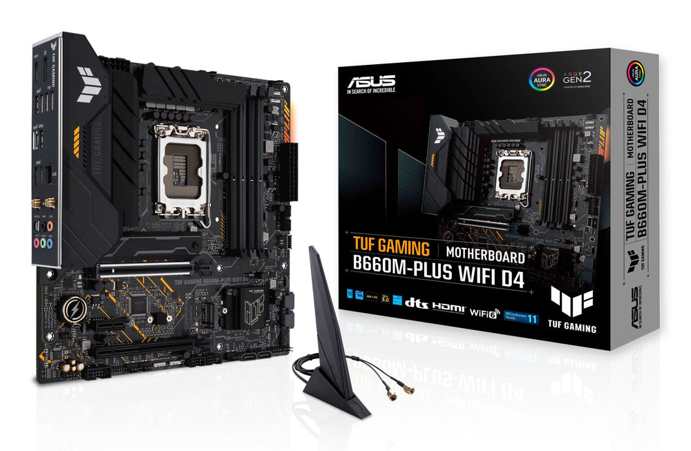 Intel® LGA 1700 socket: Ready for 12th Gen Intel® processors. Enhanced power solution: 10+1 DrMOS power stages, six-layer PCB, 8+4 ProCool sockets, military-grade TUF components and Digi+ VRM for maximum durability. Comprehensive cooling: Enlarged VRM heatsink, Stack Cool 3+, Flexible M.2 heatsink, PCH heatsink, hybrid fan headers and Fan Xpert 2+. Latest connectivity: PCIe 5.0 slot, PCIe 4.0 M.2 slots, rear USB 3.2 Gen 2x2 Type-C®, front panel header for USB 3.2 Gen 1 Type-C® and Thunderbolt 4™ support. Made for online gaming: Intel® WiFi 6, Realtek 2.5Gb Ethernet, TUF LANGuard. Two-way AI Noise-Cancelation: Reduces background noise from the microphone and audio output for crystal-clear communication in games or video conferences. Durable. Stable. Reliable.. ASUS TUF GAMING B660M-PLUS WIFI D4 takes all the essential elements of the latest Intel® processors and combines them with game-ready features and proven durability. Engineered with military-grade components, an upgraded power solution and a comprehensive cooling system, this motherboard offers rock-solid and stable performance for marathon gaming. Aesthetically, TUF GAMING B660M-PLUS WIFI D4 sports the new TUF Gaming logo and incorporates simple geometric design elements to reflect the dependability and stability that defines the TUF Gaming series.. Rock-Solid Performance. With upgraded power delivery and comprehensive cooling options to drive the 12th Gen Intel Core™ processors, plus support for faster memory and storage, TUF GAMING B660M series motherboards are the perfect foundation for your next high-core-count battle rig.. Power Design. DrMOS. The onboard VRMs feature 10+1 DrMOS power stages that combine high-side and low-side MOSFETs and drivers into a single package, delivering the power and efficiency that 12th Gen Intel Core processors demand.. Six-Layer PCB Design. Multiple PCB layers optimize heat management for critical components, providing more headroom to push CPUs beyond stock speeds.. ProCool Connectors. Enhanced EATX 8-Pin and 4-Pin Connectors. ・ Provide extreme durability. ・ Prevent hotspots and connector failure. Compared to traditional power inputs, ASUS ProCool connectors are built to tight specifications to ensure full contact with PSU power cables. The resulting lower impedance helps prevent hotspots and connector failure.. TUF Components. TUF Chokes. Certified military-grade TUF chokes deliver rock-solid power to the CPU, improving system stability.. TUF Capacitors. Proprietary capacitors provide up to 20% wider temperature tolerance and five times longer lifespan.. Digi+ VRM. The integrated Digi+ voltage-regulator module (VRM) is one of the finest in the industry, optimized for ultra-smooth and ultra-clean power delivery to the CPU at all times.. COOLING. Cooler by design. 1. Enlarged VRM heatsink. The extensive surface area of the massive heatsink covers the VRMs and chokes to improve heat dissipation.. 2. Flexible M.2 Heatsink. TUF GAMING B660M Series have flexible M.2 heatsink to use one more M.2 slot and keep the M.2 SSD at the optimum operating temperature for consistent performance and reliability.. Comprehensive Fan Controls. TUF GAMING B660M series motherboards feature comprehensive fan controls that can be configured via the Fan Xpert 2+ utility or the award-winning ASUS UEFI BIOS.. MEMORY & STORAGE. DRAM Overclocking Performance. DDR4 OC 5333. Improvements to trace routing design provide the latest Intel processors with enhanced access to memory bandwidth. ASUS OptiMem II technology carefully maps memory signal pathways across different PCB layers to reduce path distance, and it adds shielding zones that significantly reduce crosstalk.. Two PCIe 4.0 M.2. The Two PCIe 4.0 M.2 slots support up to two 2280 devices and also provide NVMe SSD RAID support for incredible performance potential. Create a RAID configuration with up to two PCIe 4.0 storage devices to enjoy the fastest data transfer speeds.. CONNECTIVITY. PCIe 5.0. The 12th Gen Intel processors bring PCIe 5.0 support to the market. PCIe 5.0 offers twice the data transfer speed of PCIe 4.0, making it robust enough to handle new data-heavy tasks. PCIe 5.0 also brings other benefits, such as electrical changes to improve signal integrity, backward-compatible CEM connectors for add-in cards, and backward compatibility with previous versions of PCI Express. Front USB Port. A full complement of USB ports support high-end rigs loaded with peripherals, including a front-panel USB 3.2 Gen 1 Type-C® connector that provides data transfer speeds of up to 5 Gbps.. USB 3.2 Gen 2x2 Type-C®. Extensive USB support ensures connections to a wide array of peripherals. TUF GAMING B660M-PLUS WIFI D4 includes a USB 3.2 Gen 2x2 Type-C® port on the rear I/O panel that delivers increased bandwidth and transmission speeds of up to 20 Gbps.. Thunderbolt™ 4 Support. TUF GAMING B660M series features Thunderbolt™ 4 support via an on-board header. With an Intel-certified ASUS ThunderboltEX 4 add-on card* TUF GAMING B660M-PLUS WIFI D4 can also enable bi-directional speeds of up to 40 Gbps on a single cable. Additionally, this card has a daisy-chain function for multi-screen connection and supports up to an 8K resolution display. It can also provide up to 100 watts of power to fast-charge devices.. * ASUS ThunderboltEX 4 add-on card is sold separately.. 40 Gbps via Thunderbolt 4. Consistent, superfast performance. Easy PC DIY. TUF GAMING motherboards are designed to be easy to set up and configure just the way you want — even for first-time builders. The TUF GAMING Alliance ecosystem makes selecting compatible parts easy, while Armoury Crate software provides Fan Xpert 2+ and hardware information and offers full full control of Two-Way AI Noise Cancellation, RGB lighting and peripheral settings. The TUF GAMING platform gives you the arsenal you need to build and optimize your dream gaming rig, without unnecessary complexity.. Build with Confidence. TUF