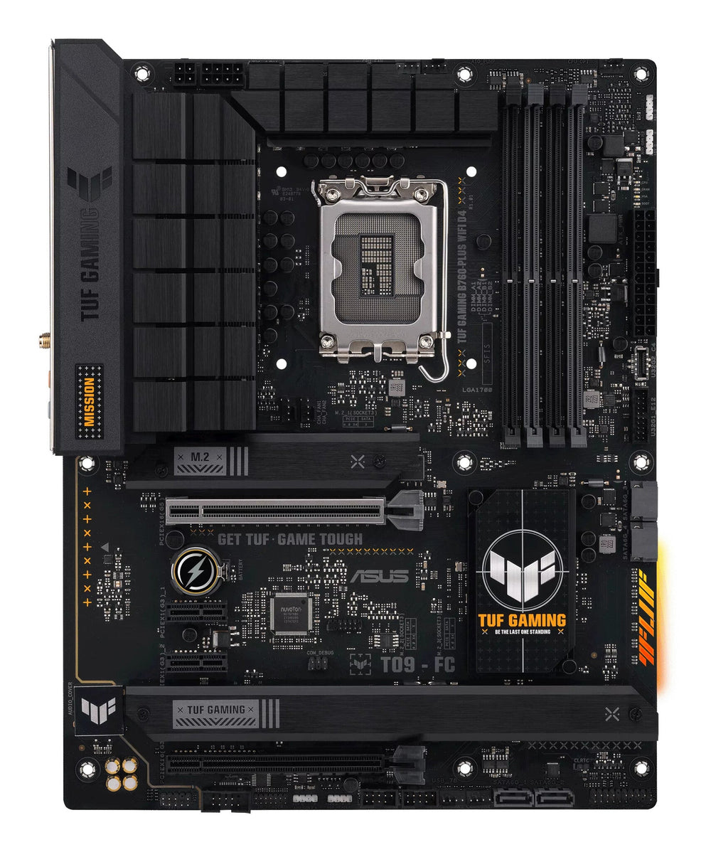 Intel LGA 1700 Intel® Celeron®, Intel® Core™ i3, Intel® Core™ i5, Intel® Core™ i7, Intel® Core™ i9, Intel® Pentium® Gold. PC ATX Intel B760 7.1 channels. DDR4-SDRAM 4 DIMM Maximum internal memory: 128 GB. HDD & SSD M.2, SATA III RAID support Number of storage drives supported: 7. BIOS type: UEFI AMI 128 Mbit. 2.5 Gigabit Ethernet Wi-Fi Wi-Fi 6 (802.11ax) Bluetooth 5.2. TUF GAMING B760-PLUS WIFI D4 takes all the essential elements of the latest Intel® processors and combines them with game-ready features and proven durability. Engineered with military-grade components, an upgraded power solution and a comprehensive cooling system, this motherboard goes beyond expectations with rock-solid performance for marathon gaming. TUF GAMING motherboards also undergo rigorous endurance testing to ensure that they can handle conditions where others may fail. Aesthetically, this model incorporates an embossed nameplate and geometric design elements to reflect the dependability and stability that defines the TUF GAMING series.. INTELLIGENT CONTROL. The TUF GAMING B760 motherboards pack flexible tools to tune every aspect of your system, enabling performance tweaks to expertly match the way you play.. All-Around Energy Efficiency. The Power Saving function contains several settings that can easily optimize power consumption and maximize energy savings. You can enable a CPU power limit, darken Aura lighting, and set the fan profile to a power saving mode. You can also toggle the Power Saver plan that is built into Microsoft Windows.. UEFI BIOS. The renowned ASUS UEFI BIOS provides everything you need to configure, tweak and tune your system. It offers intelligently simplified options for PC DIY beginners and comprehensive features for seasoned veterans.. Armoury Crate. The ASUS-exclusive Armoury Crate software centralizes control of all supported gaming products. A single intuitive interface lets you customize RGB lighting for all compatible devices and link them to Aura Sync for unified illumination. It also displays information from, and enables control of, a growing hardware ecosystem. Armoury Crate also enables easy product registration and features a news section to keep you in touch with the gaming community.. ROCK-SOLID PERFORMANCE. With upgraded power delivery and comprehensive cooling options to fuel the latest Intel CPUs, plus support for DDR4 memory and PCIe 4.0 storage, the TUF GAMING B760-PLUS WIFI D4 is the perfect foundation for your next Intel battle rig.. DrMOS Power Stages. 12+1 power stages combine high-side and low-side MOSFETS and drivers into a single package to deliver power, efficiency and stable performance for all compatible Intel processors.. Six-Layer PCB Design. The multi-layered printed circuit board design quickly dissipates heat around the voltage regulators to improve overall system stability and provide the CPU with more overclocking headroom.. 8+4 Pin ProCool Power Connectors. Compared to most power inputs, ASUS ProCool connectors are built to tight specifications to ensure full contact with PSU power cables. The resulting lower impedance helps prevent hotspots and connector failure.. TUF Components. TUF Chokes. Certified military-grade TUF chokes deliver rock-solid power to the CPU, improving system stability.. TUF Capacitors. The TUF 5K black metallic capacitors provide 52% wider temperature tolerance and a 2.5X-longer lifespan than standard motherboard capacitors.. Digi+ VRM. The integrated Digi+ voltage-regulator module (VRM) is one of the finest in the industry, optimized for ultra-smooth and ultra-clean power delivery to the CPU at all times.. DRAM Overclocking Performance. Improvements to trace routing design provide the latest Intel processors with enhanced access to memory bandwidth. ASUS OptiMem II technology carefully maps memory signal pathways across different PCB layers to reduce path distance, and it adds shielding zones that significantly reduce crosstalk.. PCIe 4.0 Support. The three PCIe 4.0 M.2 slots support up to one 22110 devices and also provide NVMe SSD RAID support for incredible performance potential.. Cooler By Design. The TUF GAMING B760-PLUS WIFI D4 is armed with an enlarged VRM heatsink, while three M.2 slots and the PCH feature heatsinks that provide the perfect balance of mass and surface area for heat dissipation.. Comprehensive Fan Controls. TUF GAMING B760 motherboards feature comprehensive fan controls that can be configured via the Fan Xpert 4 utility in Armoury Crate or via the award-winning ASUS UEFI BIOS.. Each header can be set to monitor and react to three user-configurable thermal sensors for workload-based cooling, and all settings can be easily managed by Fan Xpert 4 or via the UEFI.. Connectivity. The TUF GAMING B760-PLUS WIFI D4 reaches new heights of performance potential with the latest version of PCI Express, while an arsenal of USB ports includes two Type-C connections, and Thunderbolt 4 expands compatibility and bandwidth even further.. EASY PC DIY. The TUF GAMING line offers easy setup for all builders. The TUF GAMING Alliance ecosystem grants compatibility, while Armoury Crate has Fan Xpert 4, hardware info, Two-Way AI Noise Cancelation, RGB options and peripheral settings. This platform has intuitive tools to build and optimize dream rigs.. Build With Confidence. TUF GAMING Alliance is a collaboration between ASUS and trusted PC component brands to ensure compatibility across a wide range of parts, such as PC cases, power supplies, CPU coolers, memory kits and more. With new partnerships and components being added regularly, the TUF GAMING Alliance will continue to grow even stronger.. SafeSlot Core+ & SafeDIMM. SafeSlot Core+ is a reinforced metal sheath added to a PCIe slot to keep a card firmly installed. Because PCIe 5.0 is two times faster than PCIe 4.0, ASUS enhanced SMT manufacturing processes for the faster SafeSlot Core+ ― all to ensure users get the highest-possible data speeds. In additi